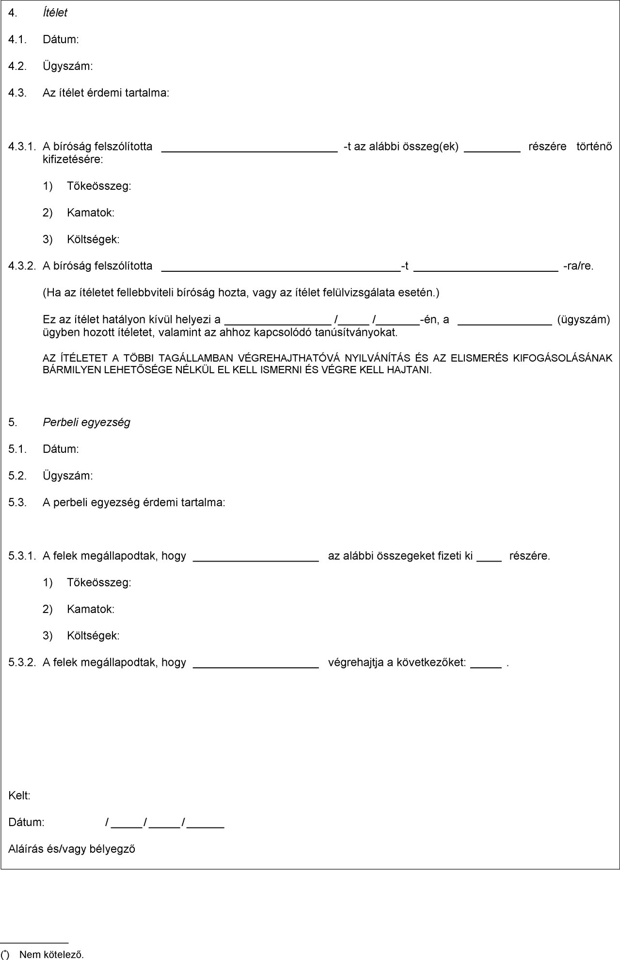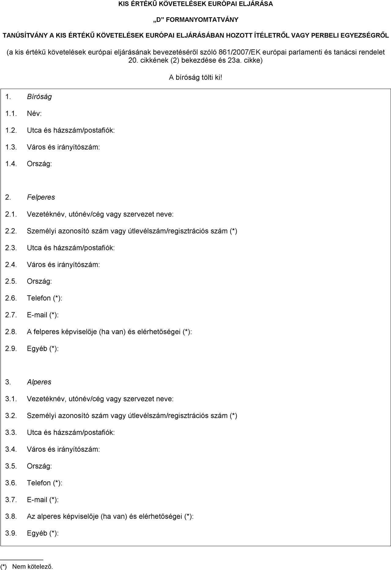 TANÚSÍTVÁNY A KIS ÉRTÉKŰ KÖVETELÉSEK EURÓPAI ELJÁRÁSÁBAN HOZOTT ÍTÉLETRŐL VAGY PERBELI EGYEZSÉGRŐL