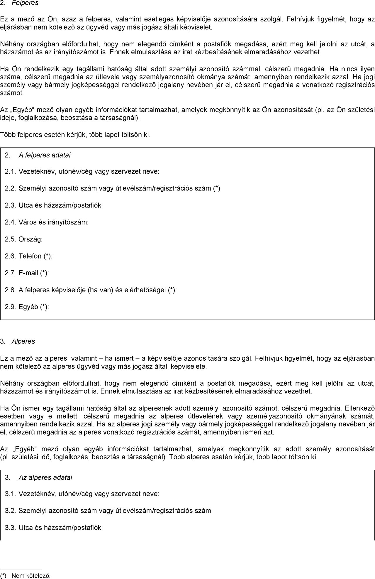 Az "Egyéb" mező olyan egyéb információkat tartalmazhat, amelyek megkönnyítik az adott személy azonosítását (pl. születési idő, foglalkozás, beosztás a társaságnál). Több alperes esetén kérjük, több lapot töltsön ki.
