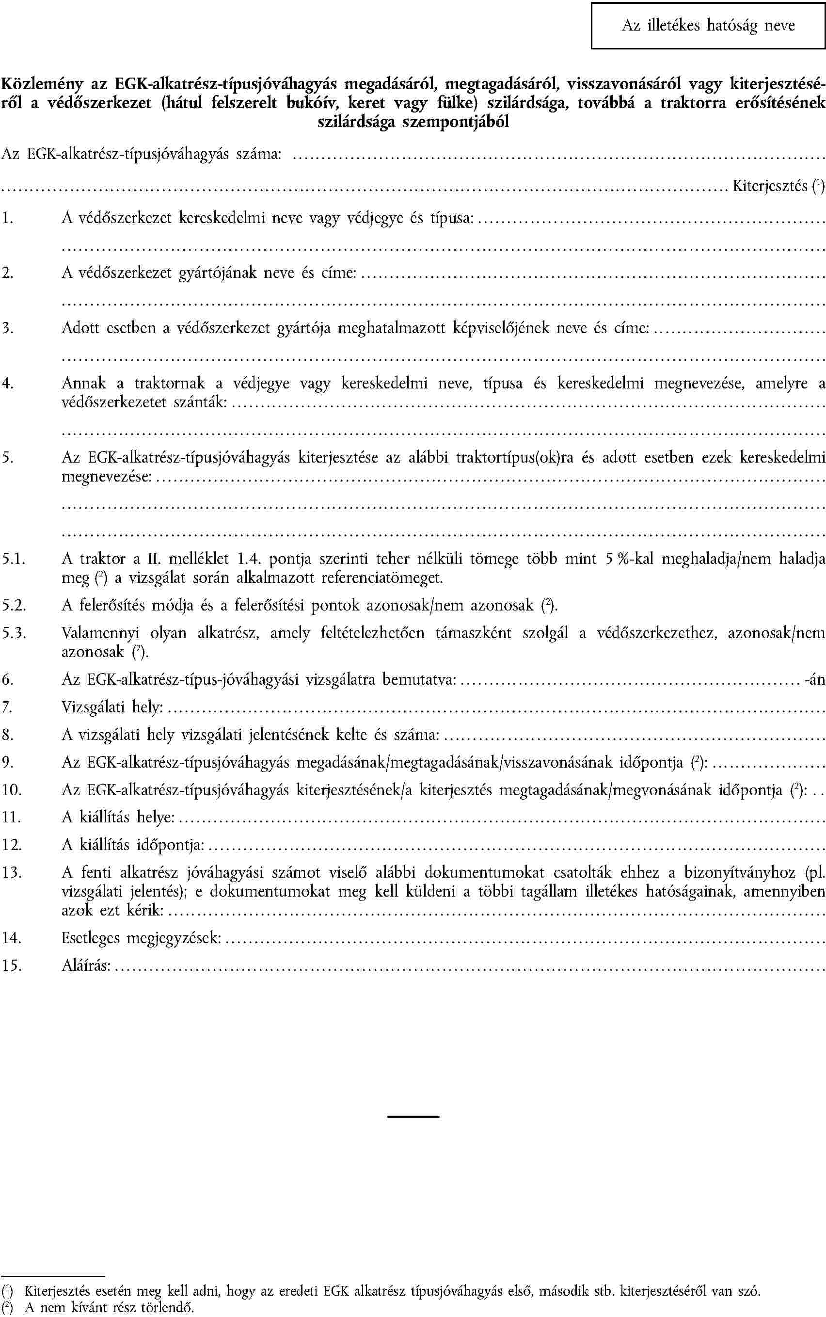 V.MELLÉKLET: | Jelentésminta EGK-alkatrész-típus-jóváhagyási vizsgálatáról a védőszerkezet szilárdsága, illetve traktorra erősítésének szilárdsága szempontjából |