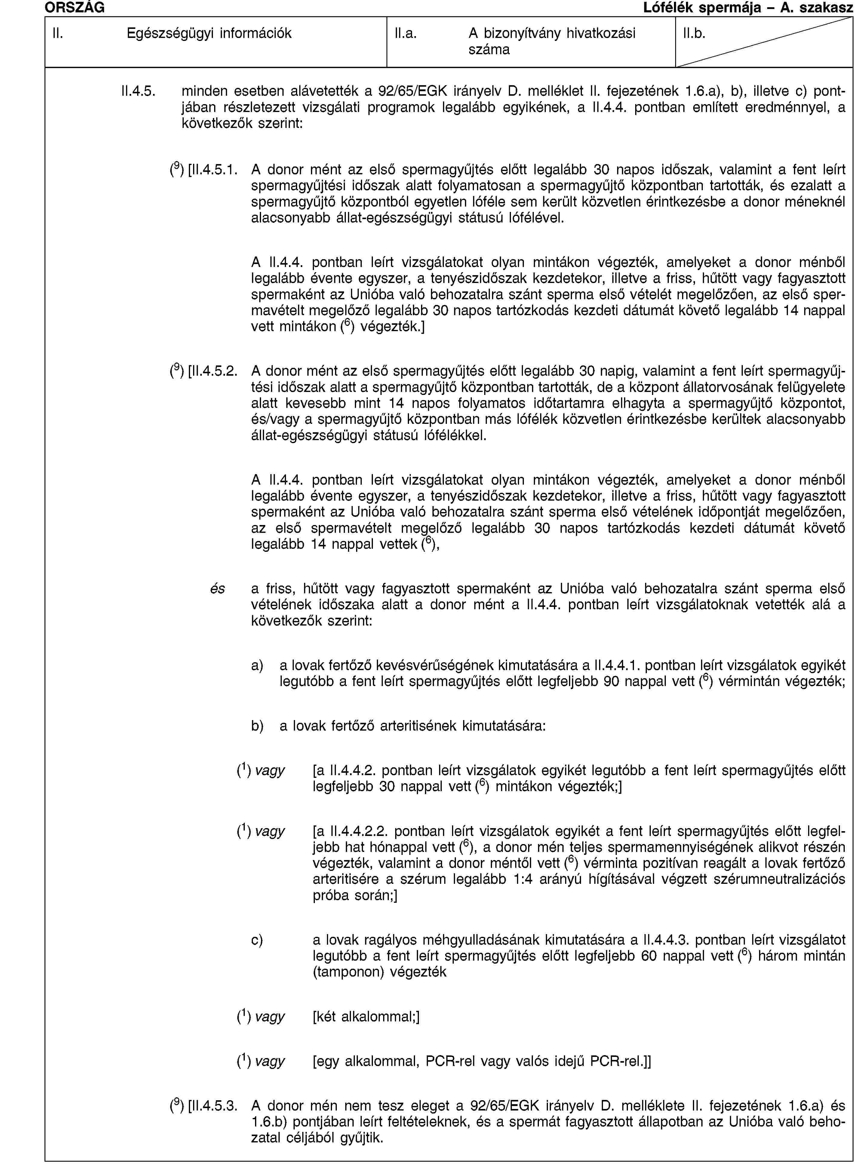 - a lófélékhez tartozó állatok 2014. szeptember 30. után a 92/65/EGK irányelvnek megfelelően gyűjtött, feldolgozott és tárolt és engedélyezett spermatároló központból feladott spermája,