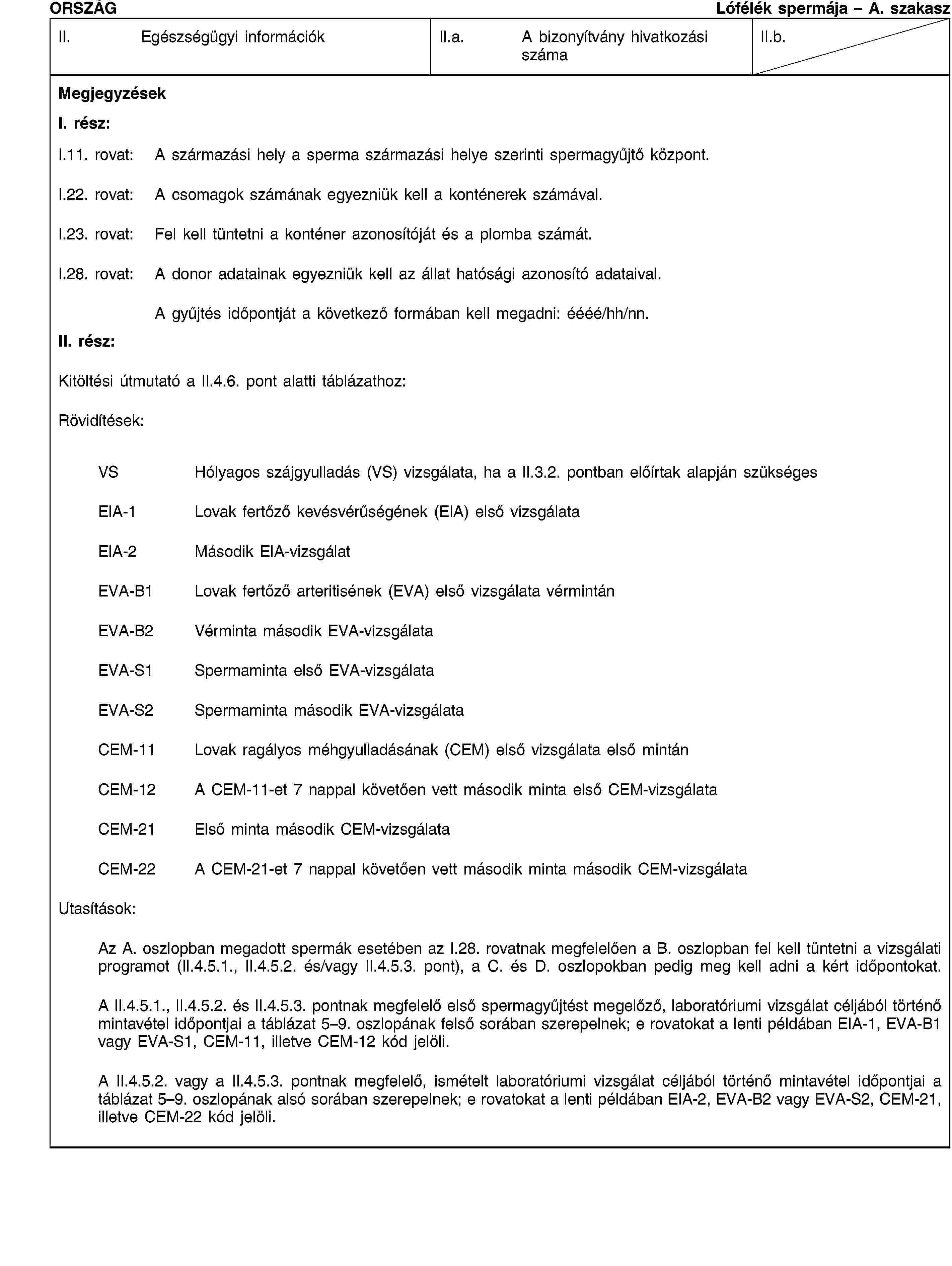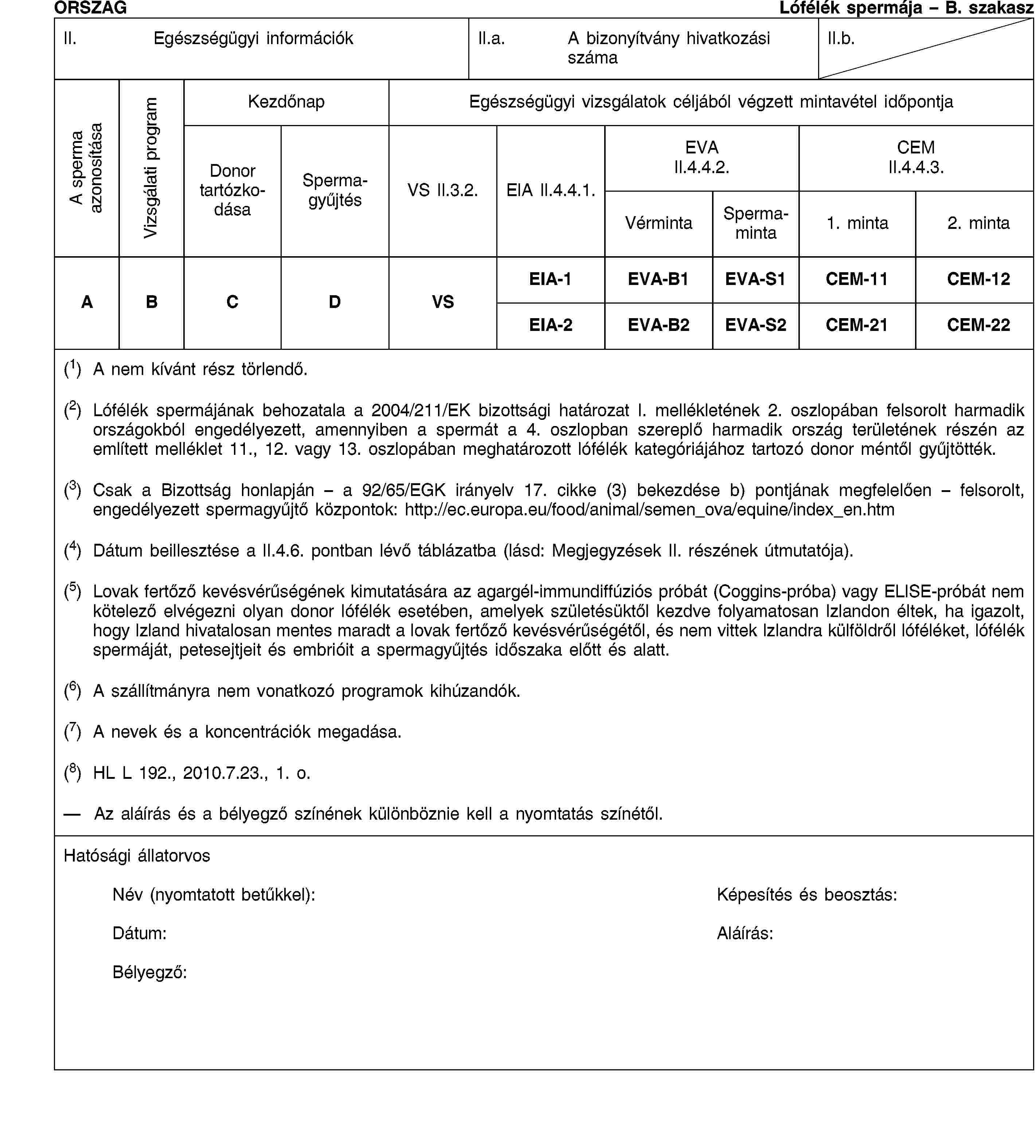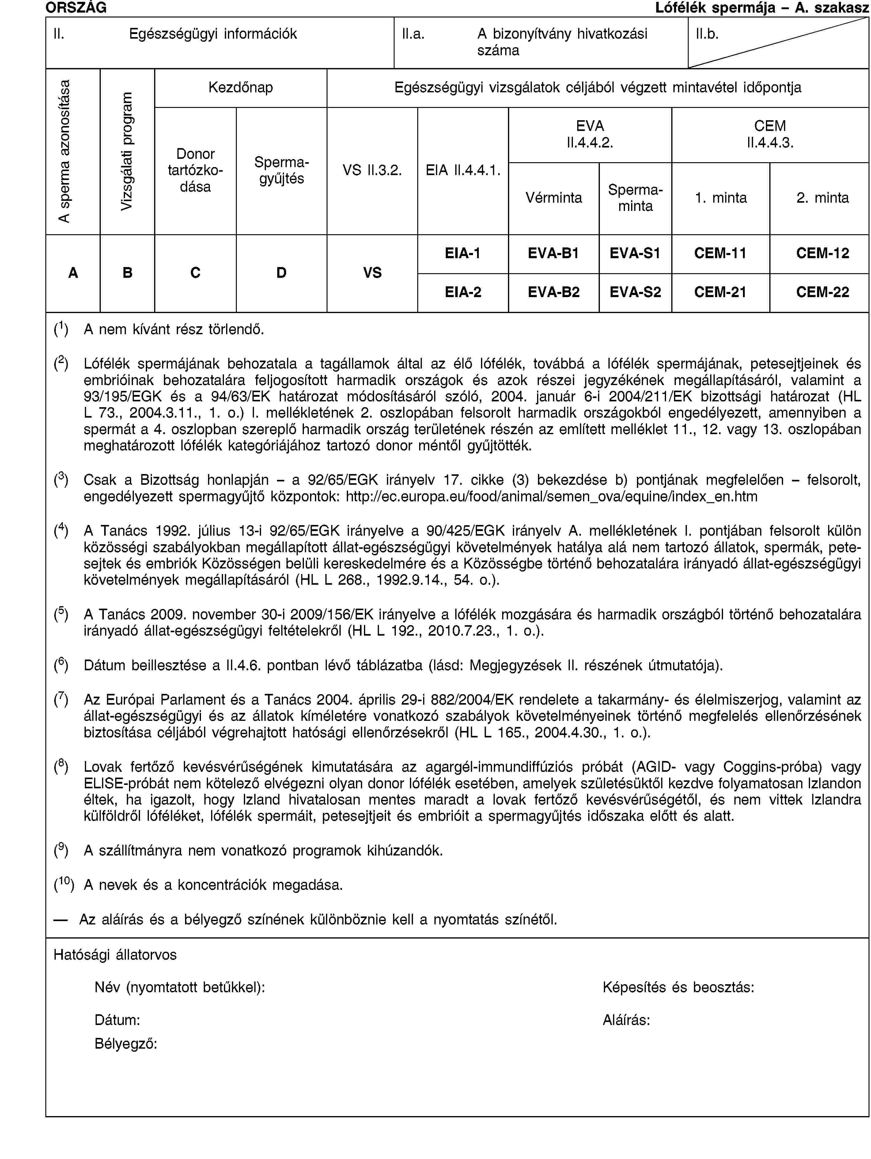 ii. 2. MINTA - Állat-egészségügyi bizonyítványminta a lófélékhez tartozó állatok 2010. augusztus 31. után és 2014. október 1. előtt a 92/65/EGK irányelvnek megfelelően gyűjtött, feldolgozott és tárolt és a sperma származási helye szerinti, engedélyezett spermagyűjtő központból 2010. augusztus 31. után feladott spermakészletei szállítmányainak behozatalához;