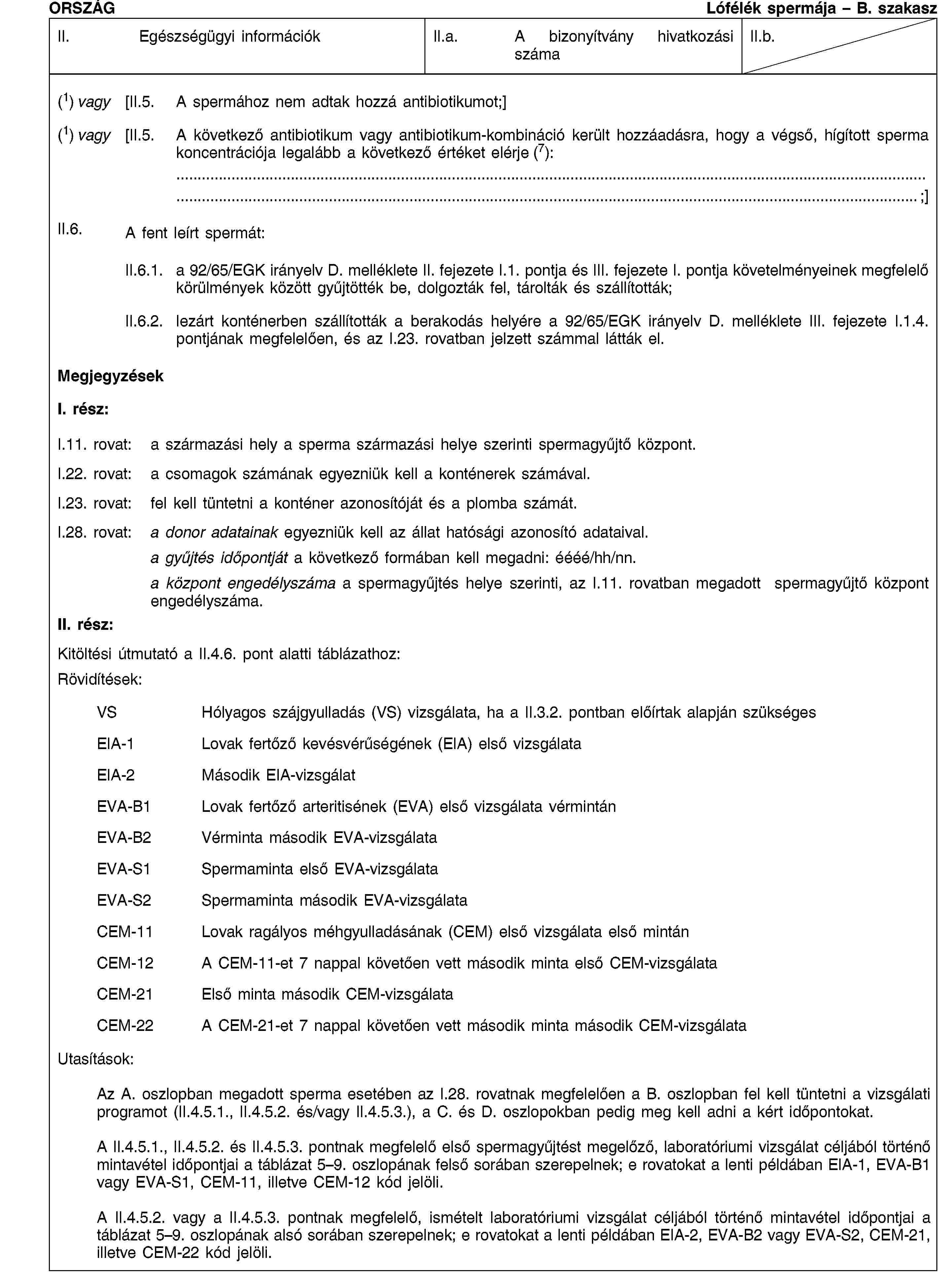 i. 1. MINTA - Állat-egészségügyi bizonyítványminta a lófélékhez tartozó állatok 2014. szeptember 30. után a 92/65/EGK irányelvnek megfelelően gyűjtött és a sperma származási helye szerinti, engedélyezett spermagyűjtő központból feladott spermaszállítmányainak behozatalához;