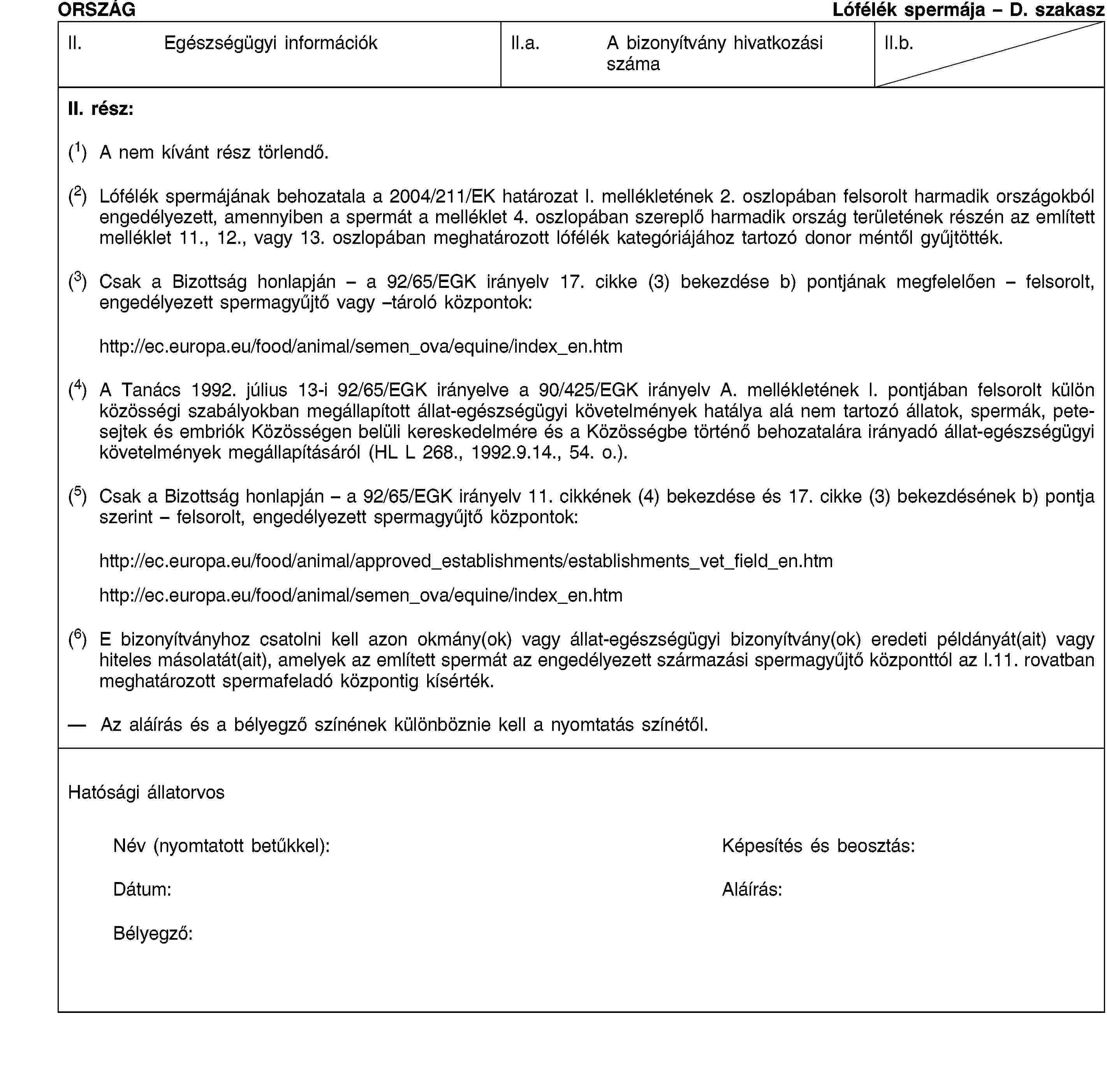 1. MINTA - Állat-egészségügyi bizonyítványminta a lófélékhez tartozó állatok 2014. szeptember 30. után a 92/65/EGK irányelvnek megfelelően gyűjtött és a sperma származási helye szerinti, engedélyezett spermagyűjtő központból feladott spermái szállítmányainak behozatalához