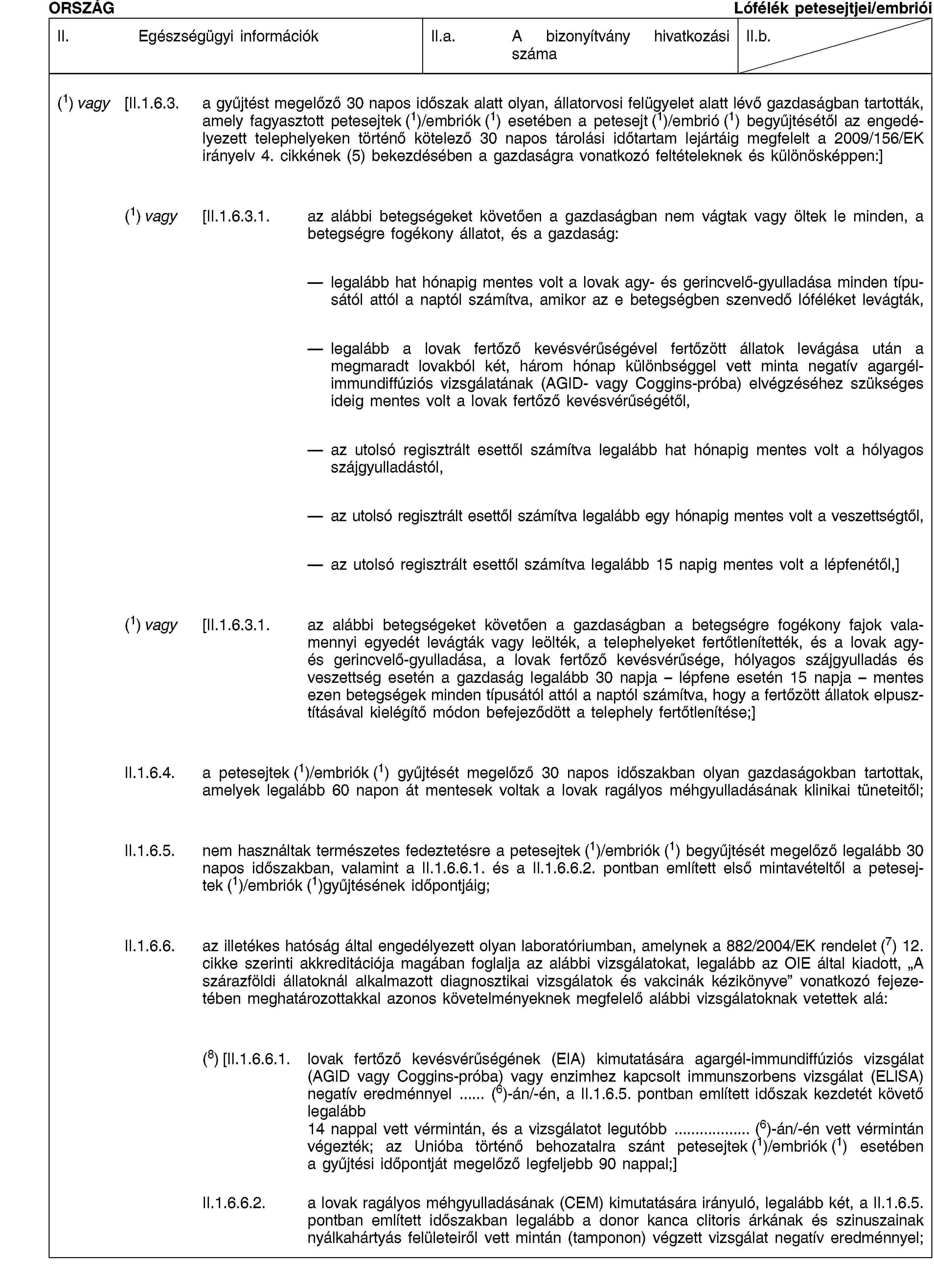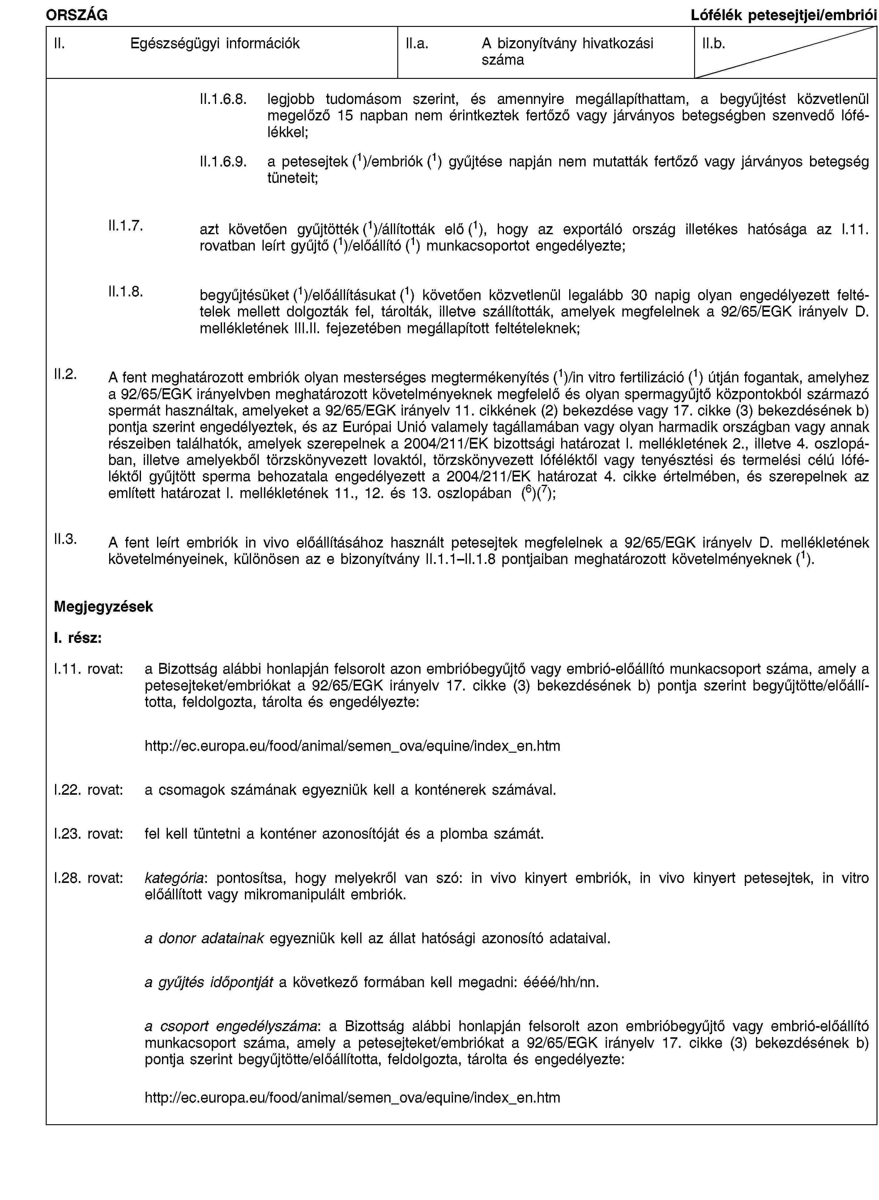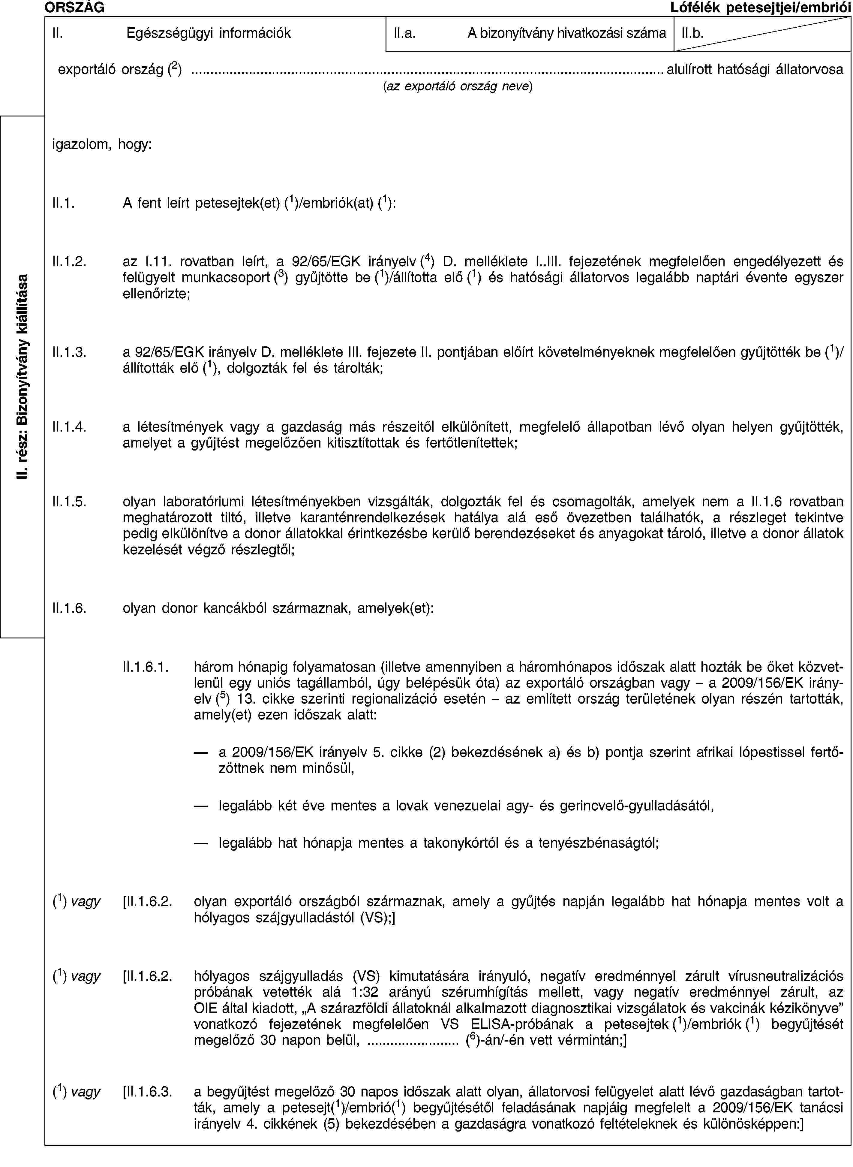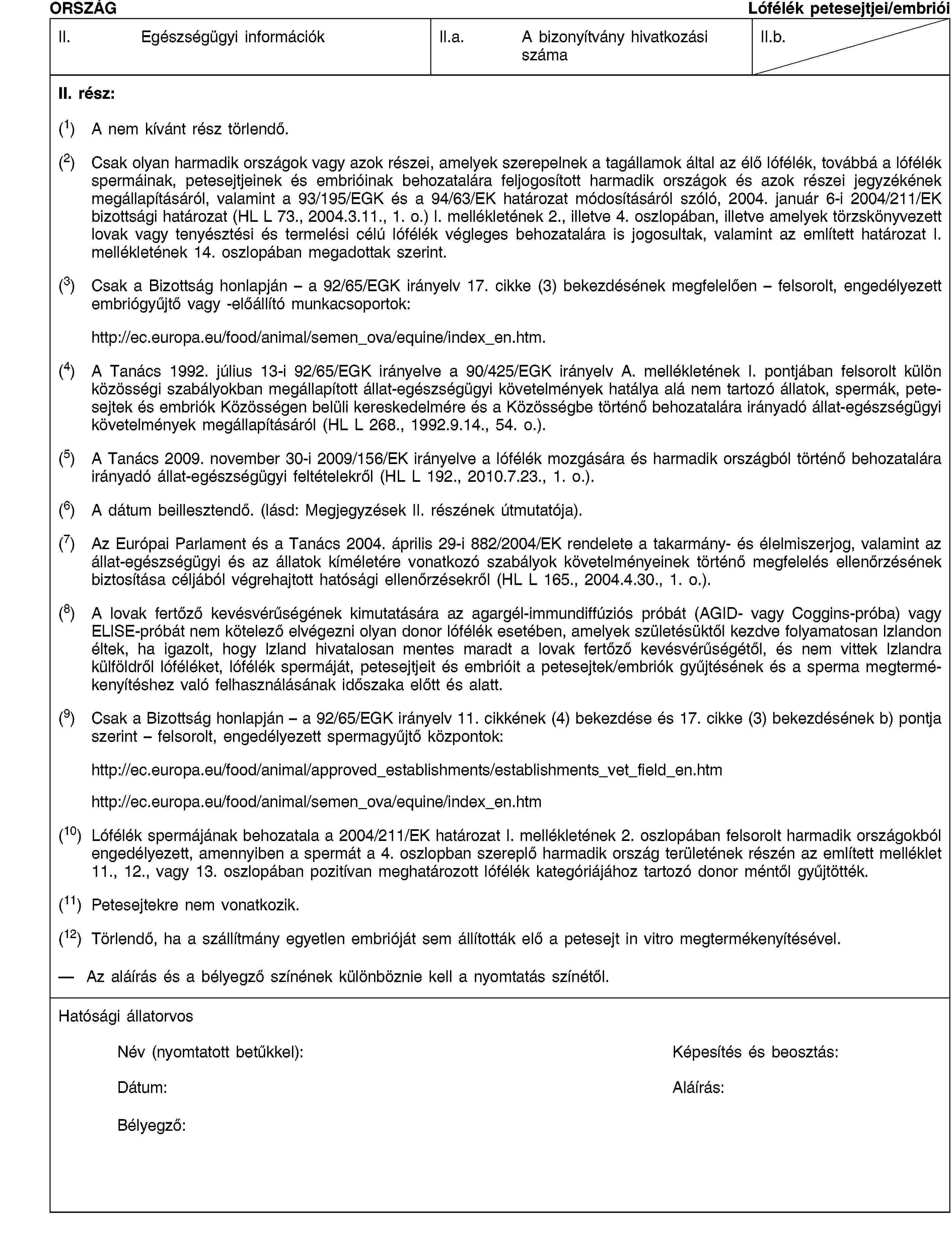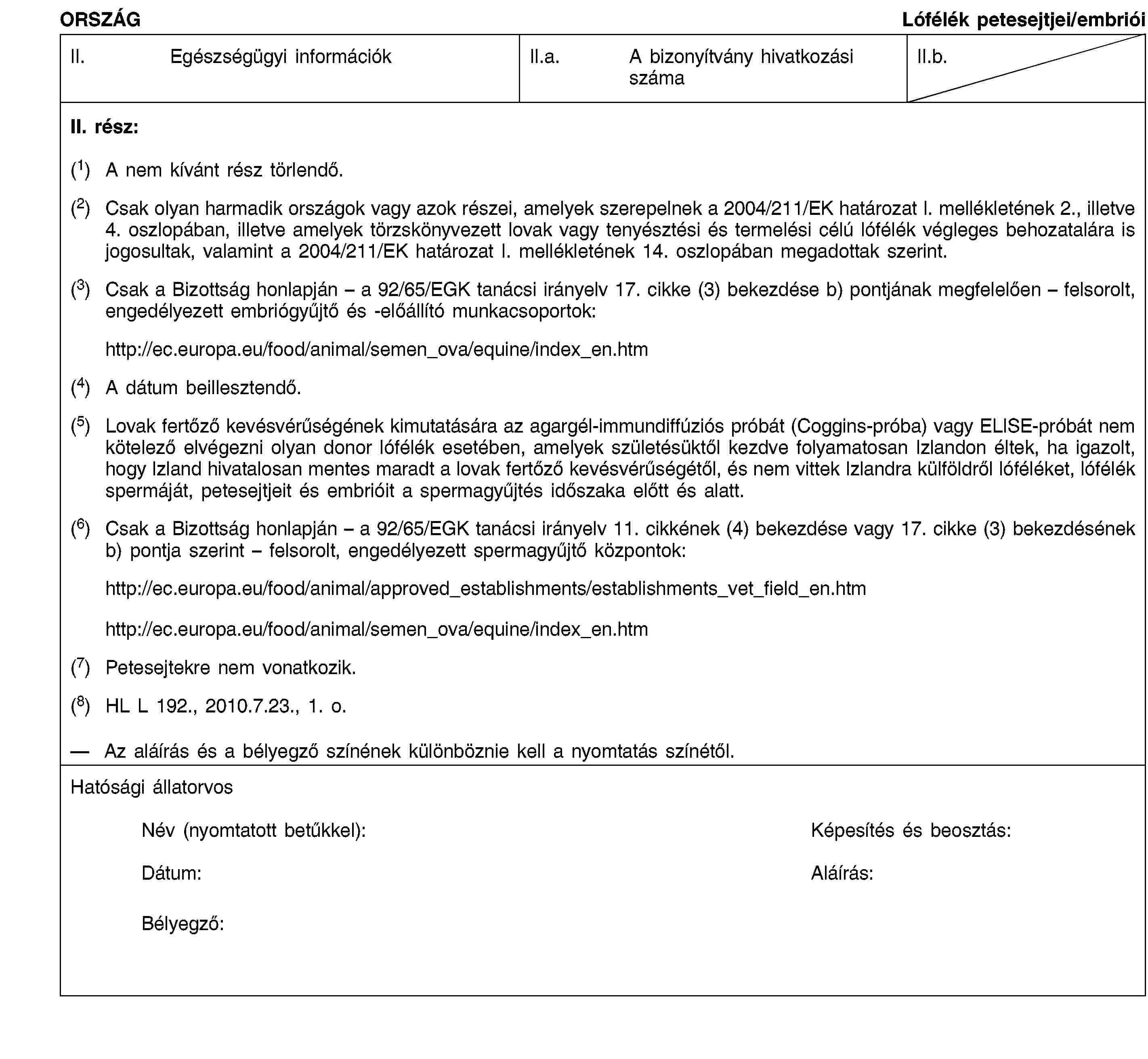 ii. 2. MINTA - Állat-egészségügyi bizonyítványminta a lófélékhez tartozó állatok 2010. augusztus 31. után és 2014. október 1. előtt a 92/65/EGK irányelvnek megfelelően gyűjtött, feldolgozott és tárolt és a petesejtek, illetve embriók származási helye szerinti, engedélyezett embriógyűjtő vagy -előállító munkacsoport által 2010. augusztus 31. után feladott petesejt- és embriókészletei szállítmányainak behozatalához.