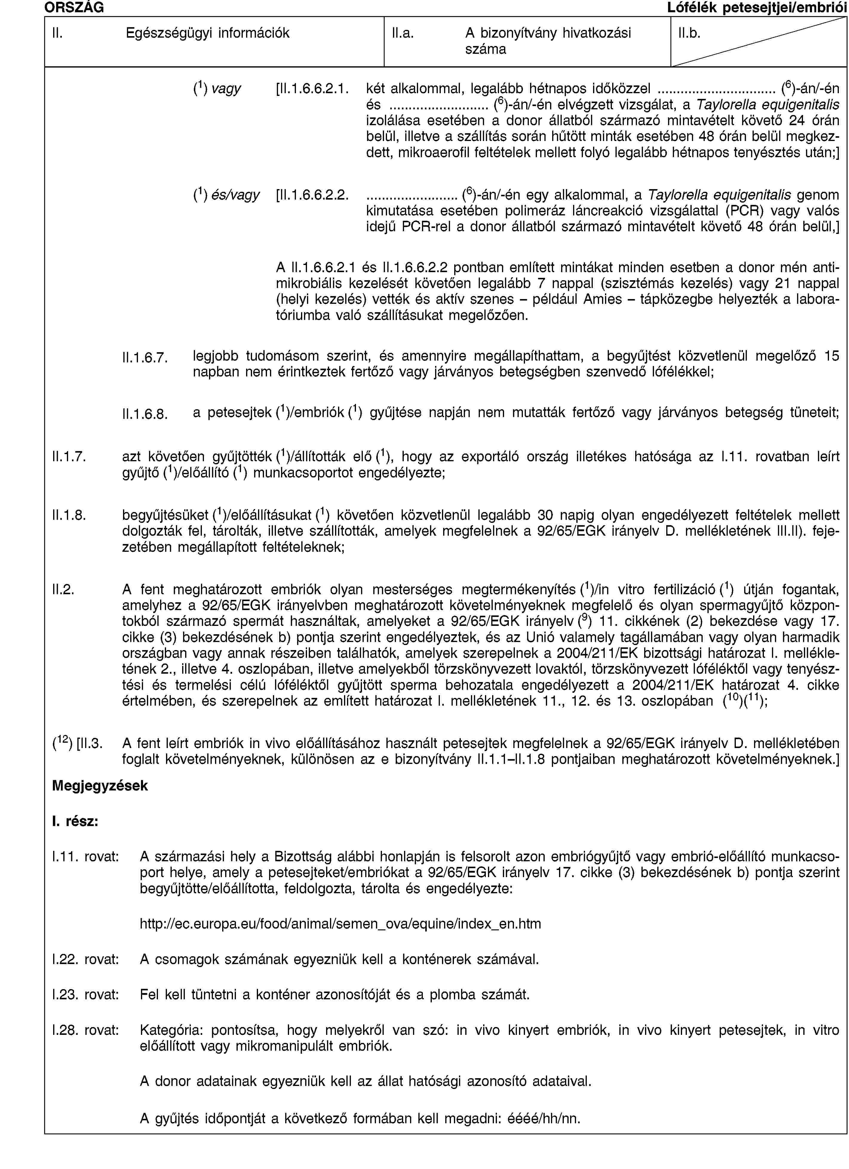 ÁLLAT-EGÉSZSÉGÜGYI BIZONYÍTVÁNYMINTÁK A LÓFÉLÉKHEZ TARTOZÓ ÁLLATOK PETESEJTJEINEK ÉS EMBRIÓINAK BEHOZATALÁHOZ