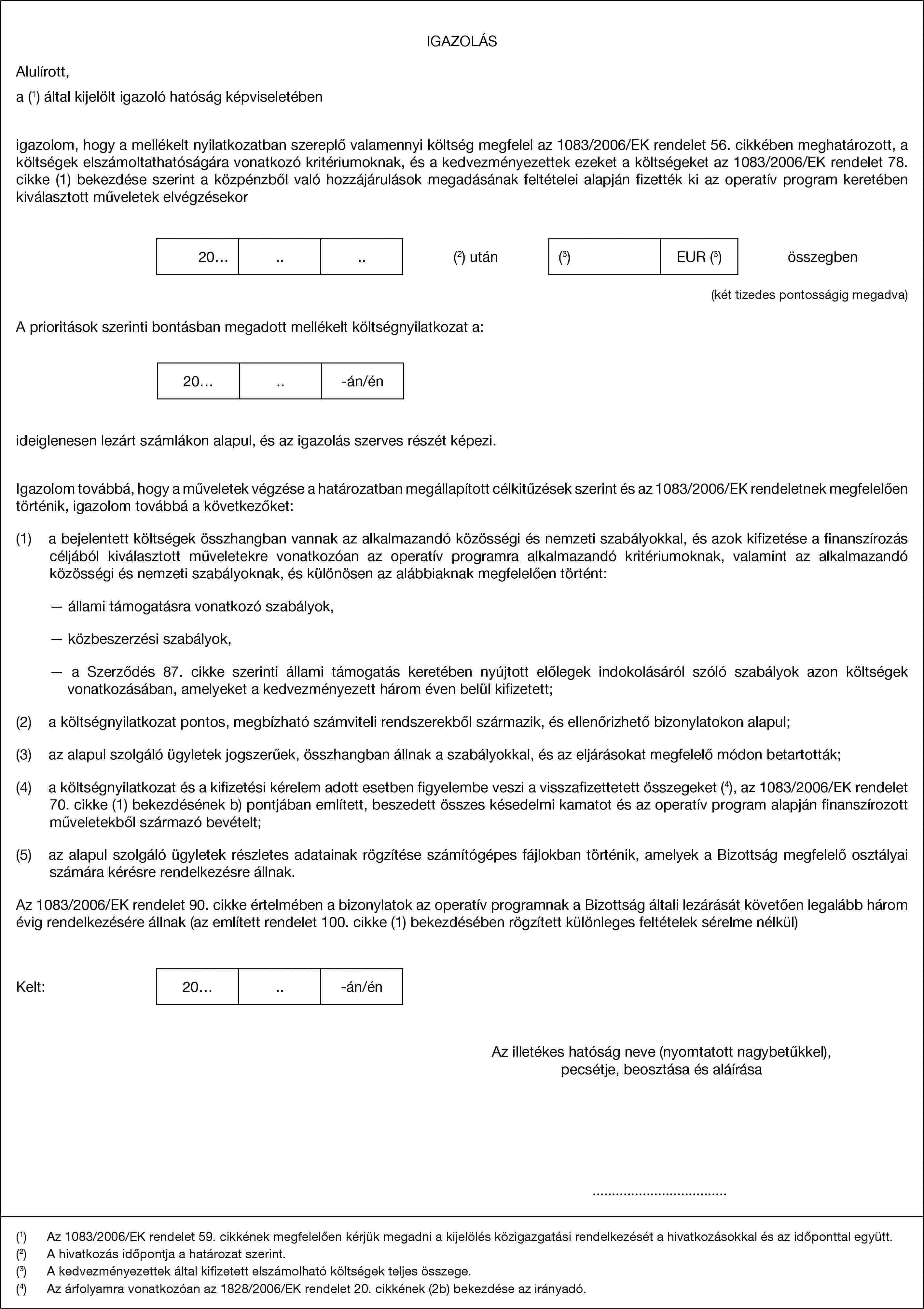 ( 31 ) Ha a nyilatkozatot az ellenőrző hatóság adta ki, ez utóbbinak az 1083/2006/EK tanácsi rendelet 62. cikke szerint külön nyilatkoznia kell illetékességéről és funkcionális függetlenségéről.