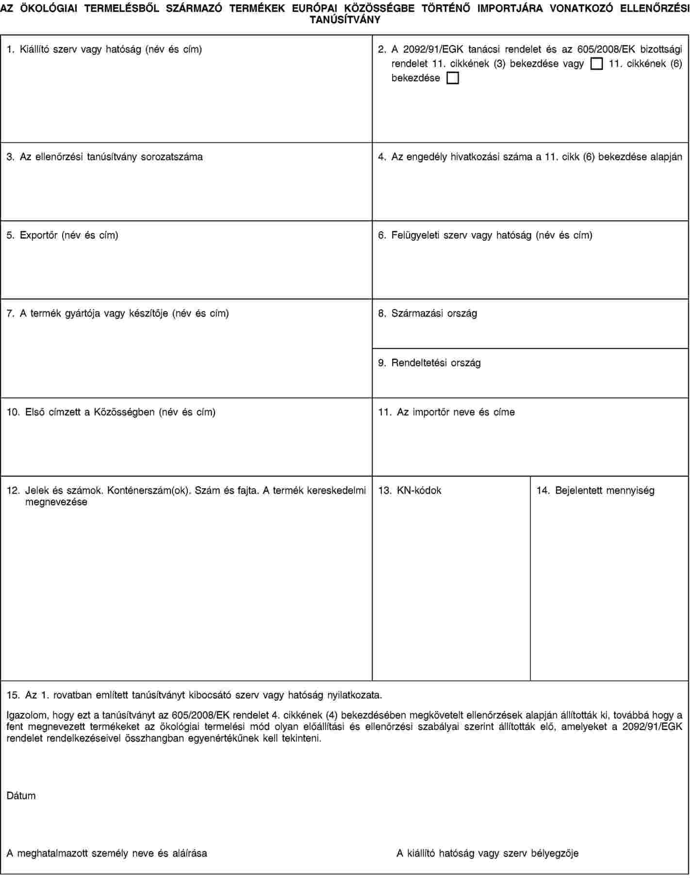 A Bizottság 605/2008/EK rendelete ( 2008. június 20.) a mezőgazdasági termékek ökológiai termeléséről, valamint a mezőgazdasági termékeken és élelmiszereken erre utaló jelölésekről szóló 2092/91/EGK tanácsi rendelet 11. cikke szerinti, harmadik országokból származó importhoz szükséges ellenőrzési tanúsítványra vonatkozó rendelkezések végrehajtása részletes szabályainak megállapításáról (kodifikált változat)