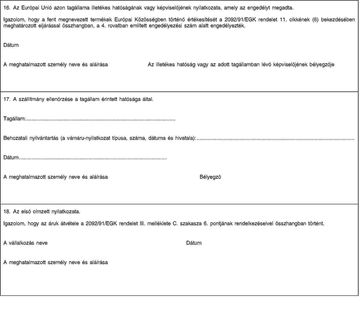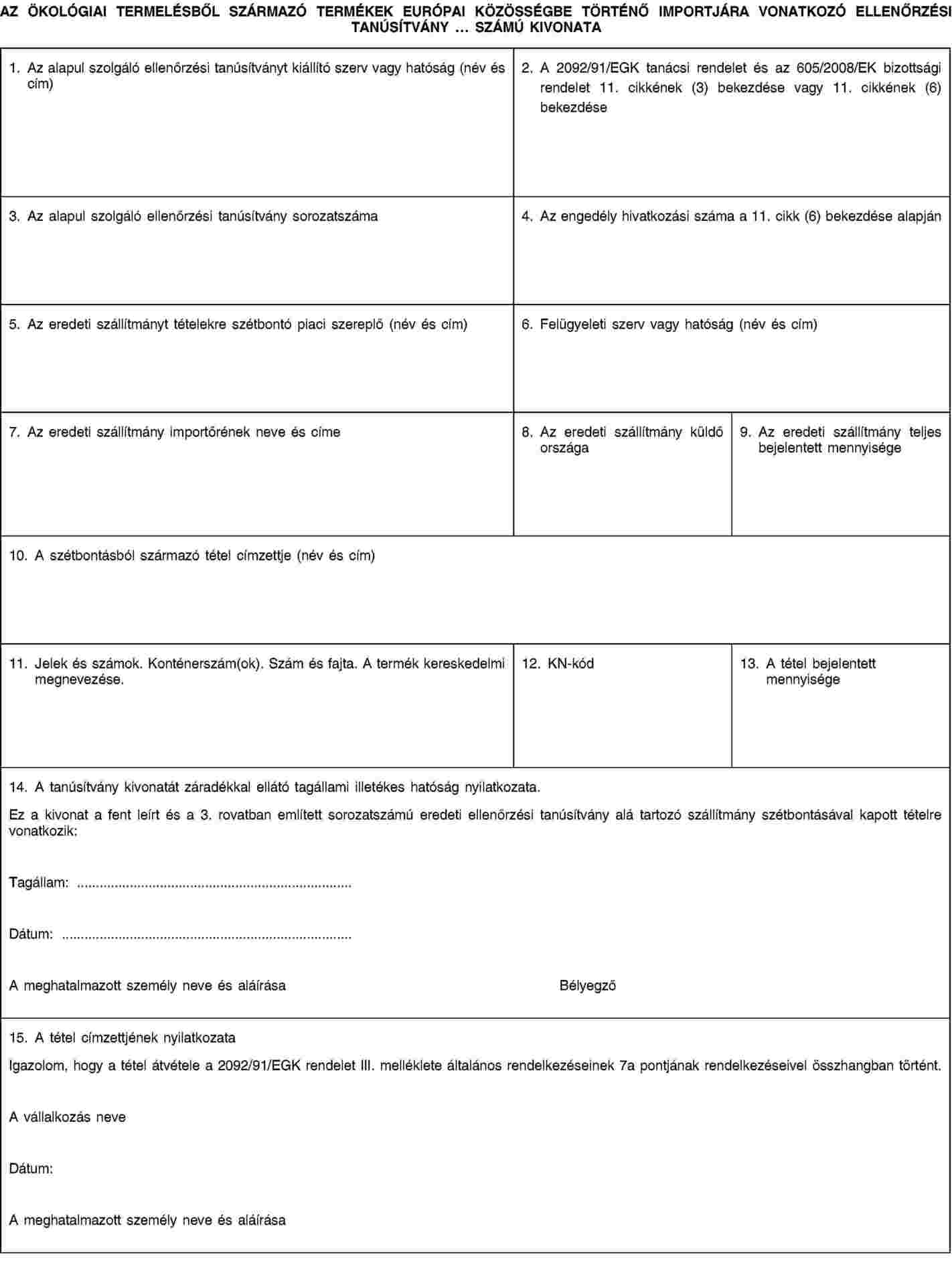 A tétel átvételekor annak címzettje kitölti az ellenőrzési tanúsítvány kivonata eredetijének 15. rovatát annak tanúsítására, hogy a tétel átvétele a 2092/91/EGK rendelet III. mellékletében szereplő általános rendelkezések 7a. pontjával összhangban történt.