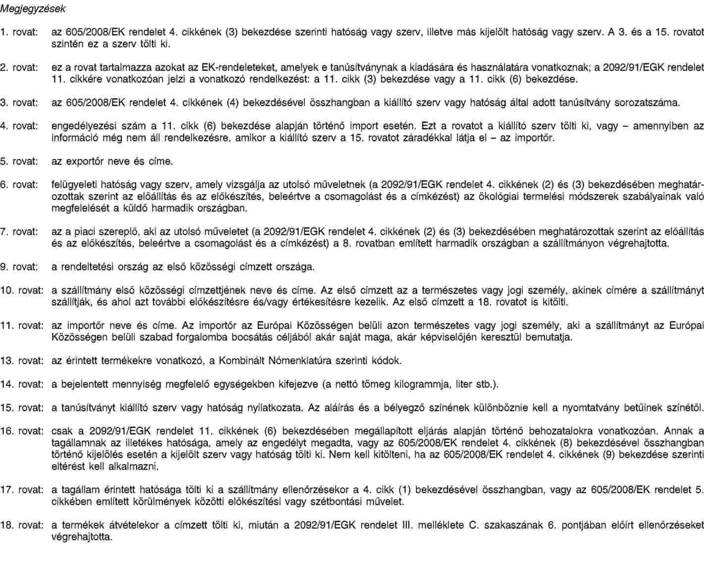 A 2092/91/EGK rendelet 11. cikk (3) bekezdése d) pontjának második és harmadik mondatában és (6) bekezdése első albekezdésének ötödik mondatában megállapított követelmény teljesítése céljából az első címzett ezt követően megküldi a tanúsítvány eredeti példányát a 11. rovatban említett importőrnek, kivéve ha a tanúsítványnak tovább kell kísérnie a szállítmányt az e rendelet 5. cikkének (1) bekezdésében említett feldolgozás céljából.