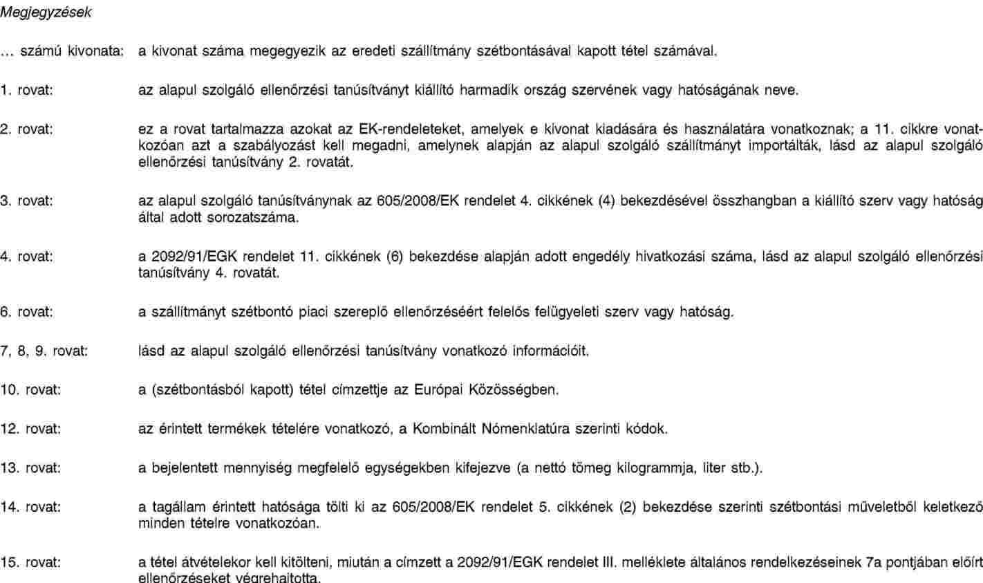 Az ellenőrzési tanúsítvány kivonatát az e rendelet II. mellékletben szereplő mintának és megjegyzéseknek megfelelően a szétbontásból származó valamennyi tételre vonatkozóan be kell nyújtani a tagállam illetékes hatóságának. Az ellenőrzési tanúsítvány kivonatát a tagállamok illetékes hatóságai a 14. rovatban hitelesítik.