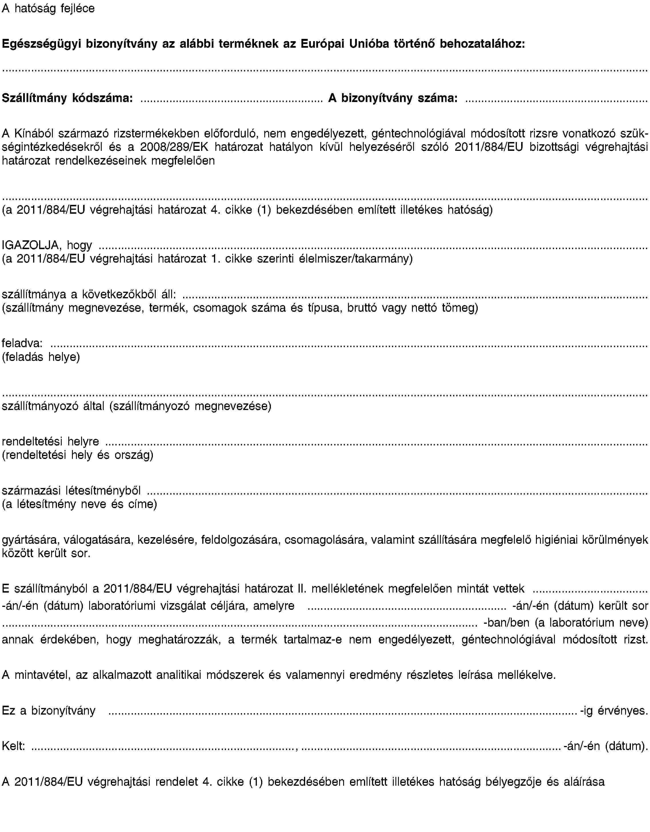 (2) Amennyiben az I. mellékletben említett termék nem tartalmaz rizst, nincs ilyen összetevője, illetve nem abból készült, akkor a vizsgálati jelentést és az egészségügyi bizonyítványt felválthatja a szállítmányért felelős takarmány- és élelmiszer-ipari vállalkozótól származó nyilatkozat, amelyben a vállalkozó igazolja, hogy az élelmiszer, illetve a takarmány nem tartalmaz rizst, nincs ilyen összetevője, illetve nem abból készült. Ezt a nyilatkozatot az importáló tagállam valamely hivatalos nyelvén vagy olyan más nyelven kell kiállítani, amelyet az érintett tagállam illetékes hatóságai elfogadnak.