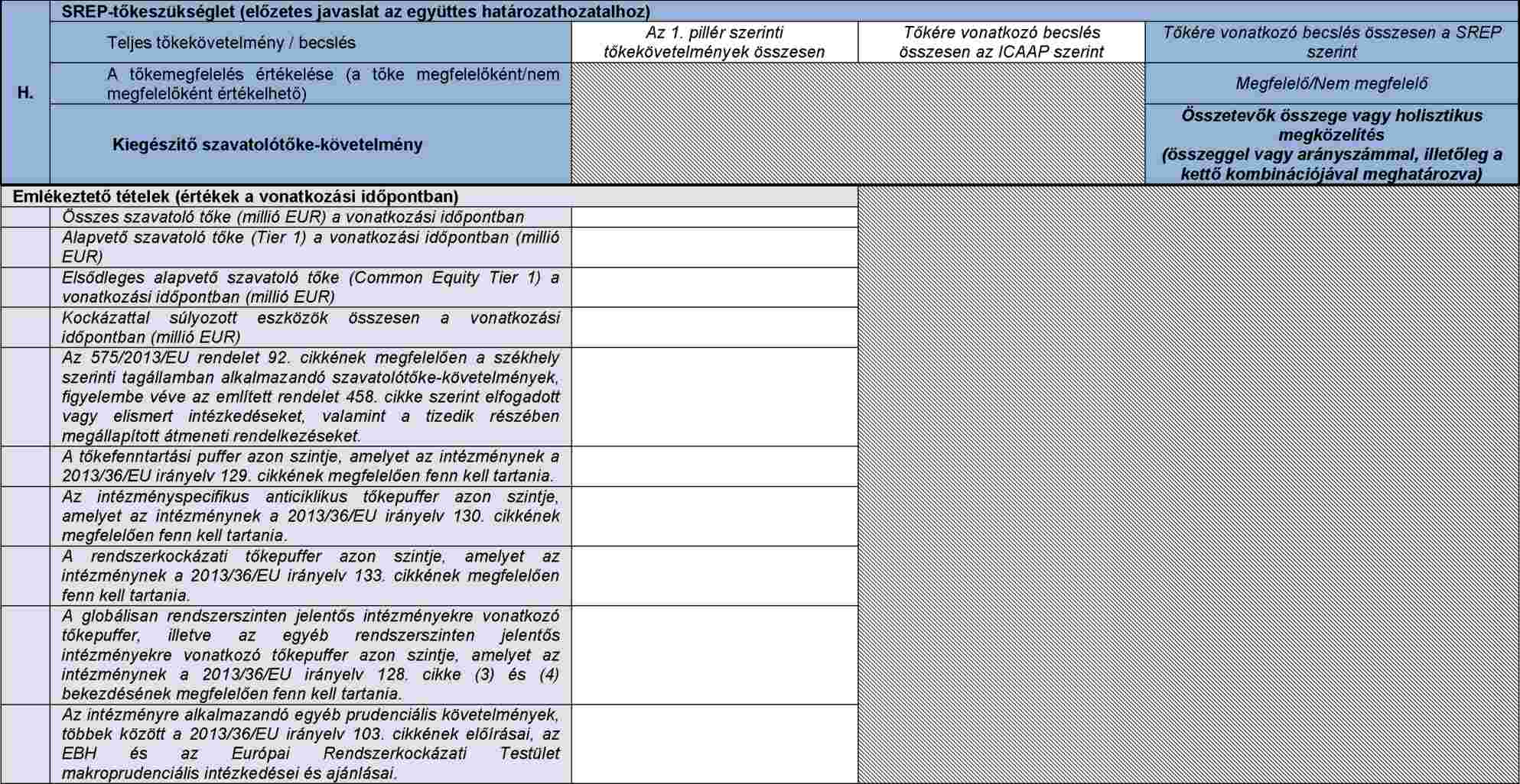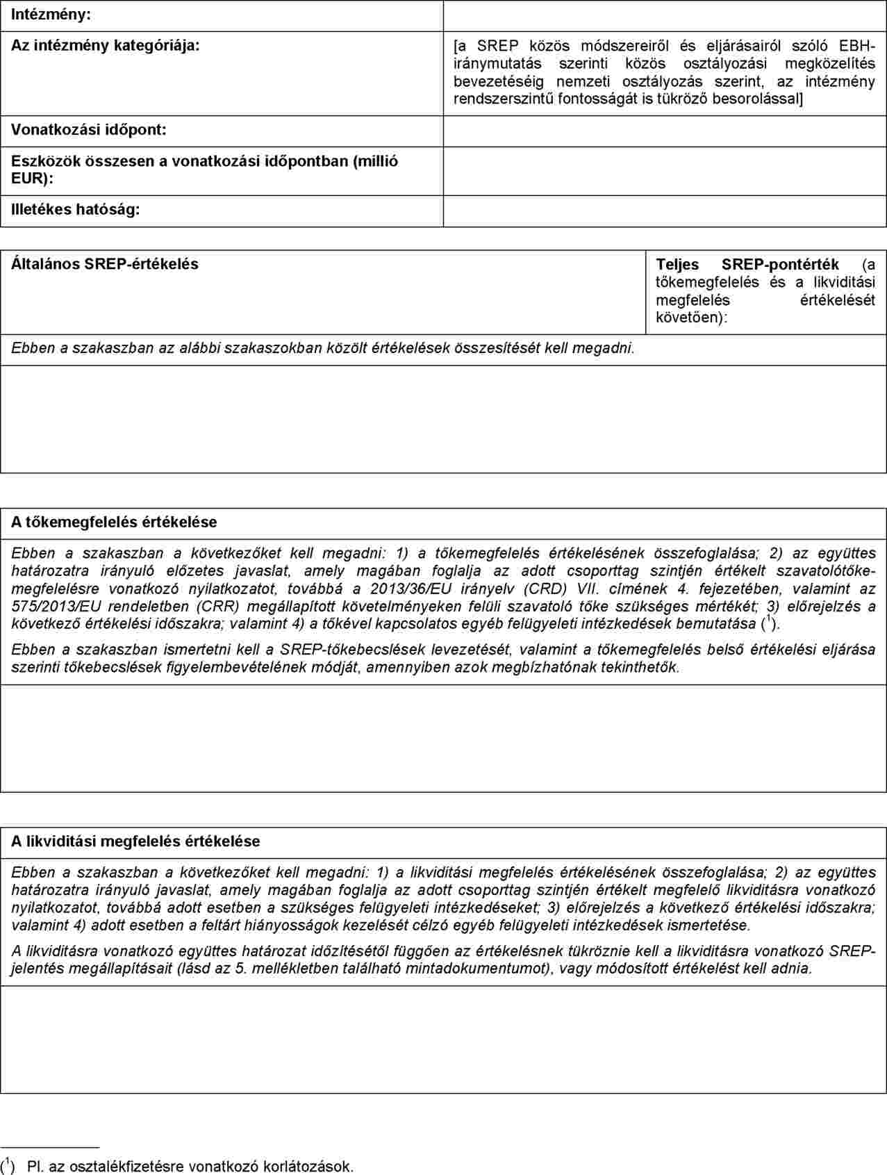 (2) A SREP-jelentéseket az I. mellékletben található tábla felhasználásával kell elkészíteni. A jelentéseket ki kell egészíteni a pontértékek II. melléklet 1. táblájának használatával készült összegzésével, valamint a tőkemegfelelőség értékelésének a II. melléklet 2. táblájának használatával készült összefoglalásával.