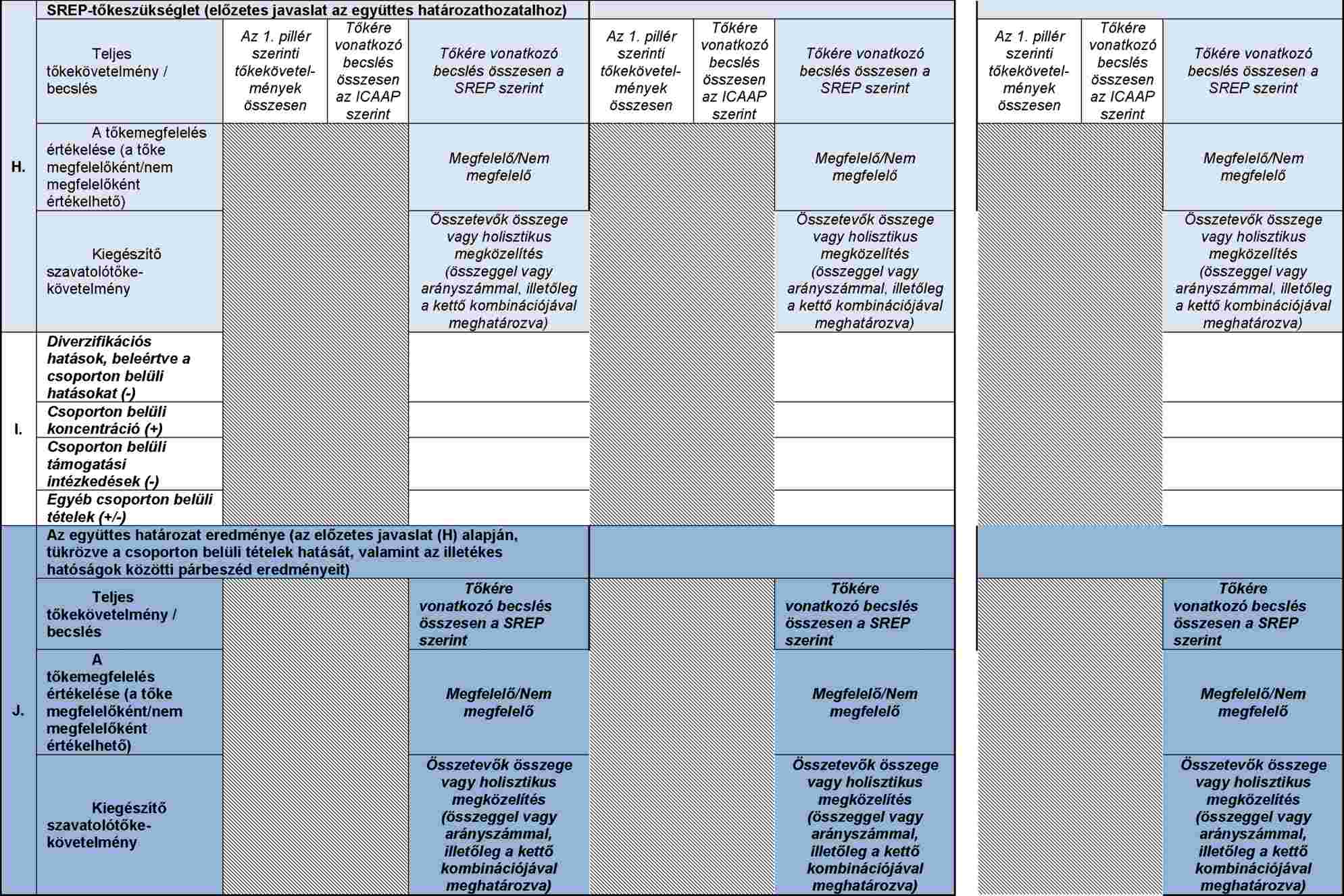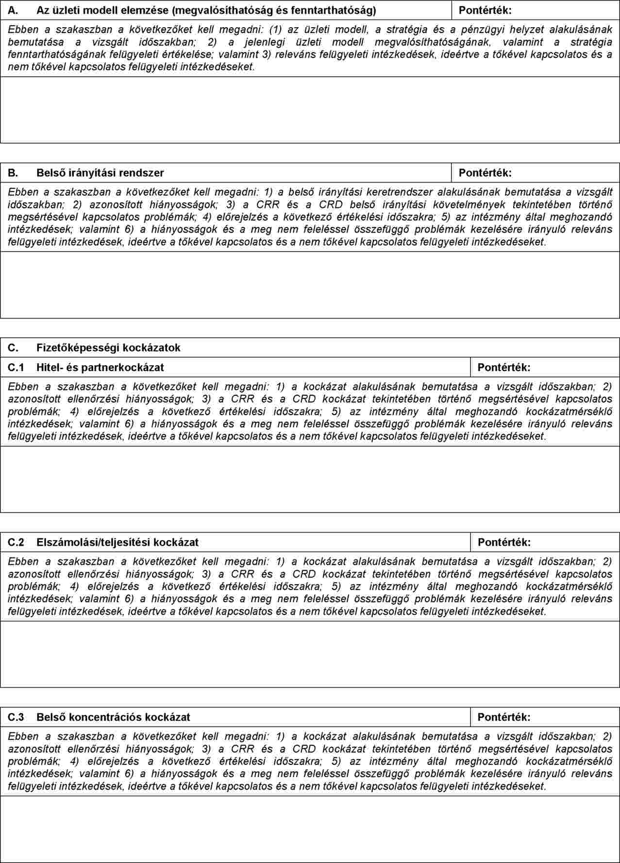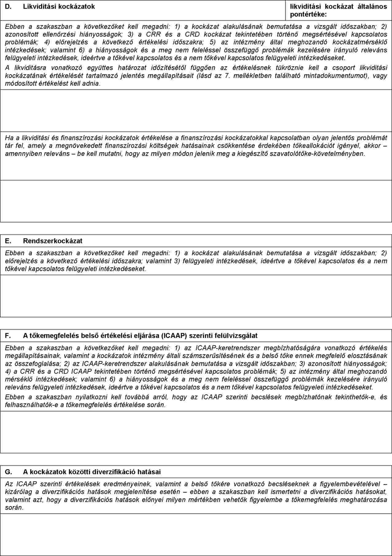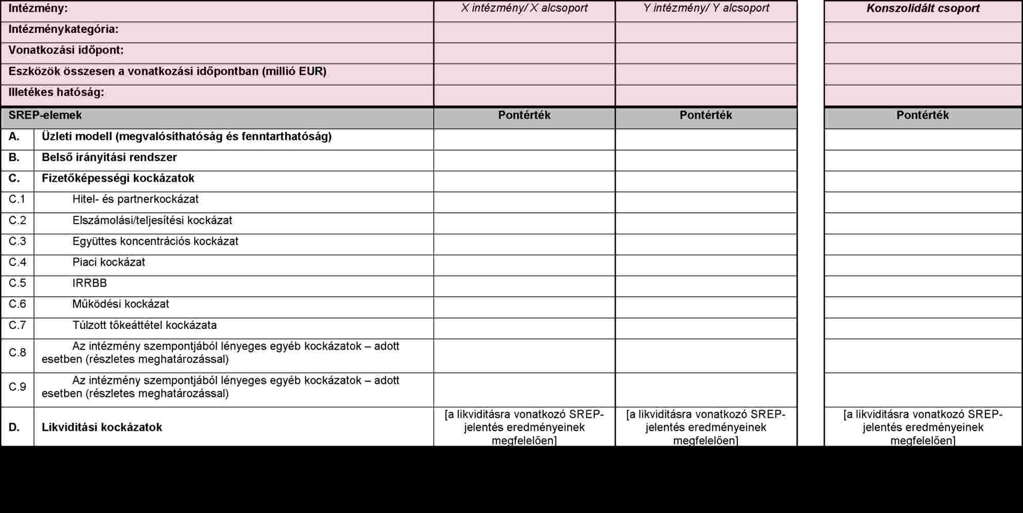 A csoport kockázatértékelését tartalmazó jelentéshez mellékletként csatolni kell az érintett illetékes hatóságok által benyújtott valamennyi SREP-jelentést. A csoport kockázatértékelését tartalmazó jelentés kiegészül a pontértékek összesítésével (1. tábla), valamint a tőkemegfelelés értékelésével (2. tábla).