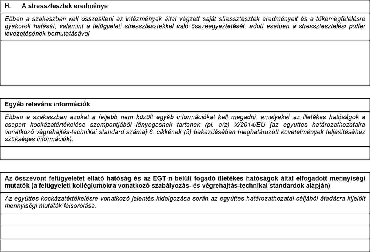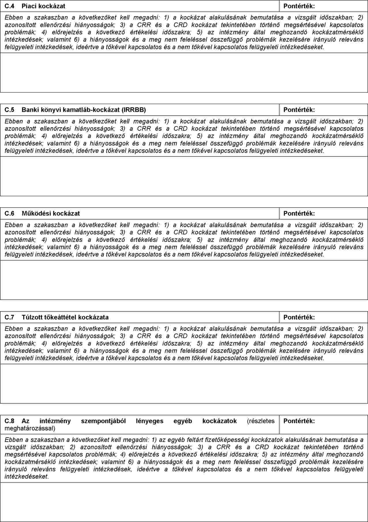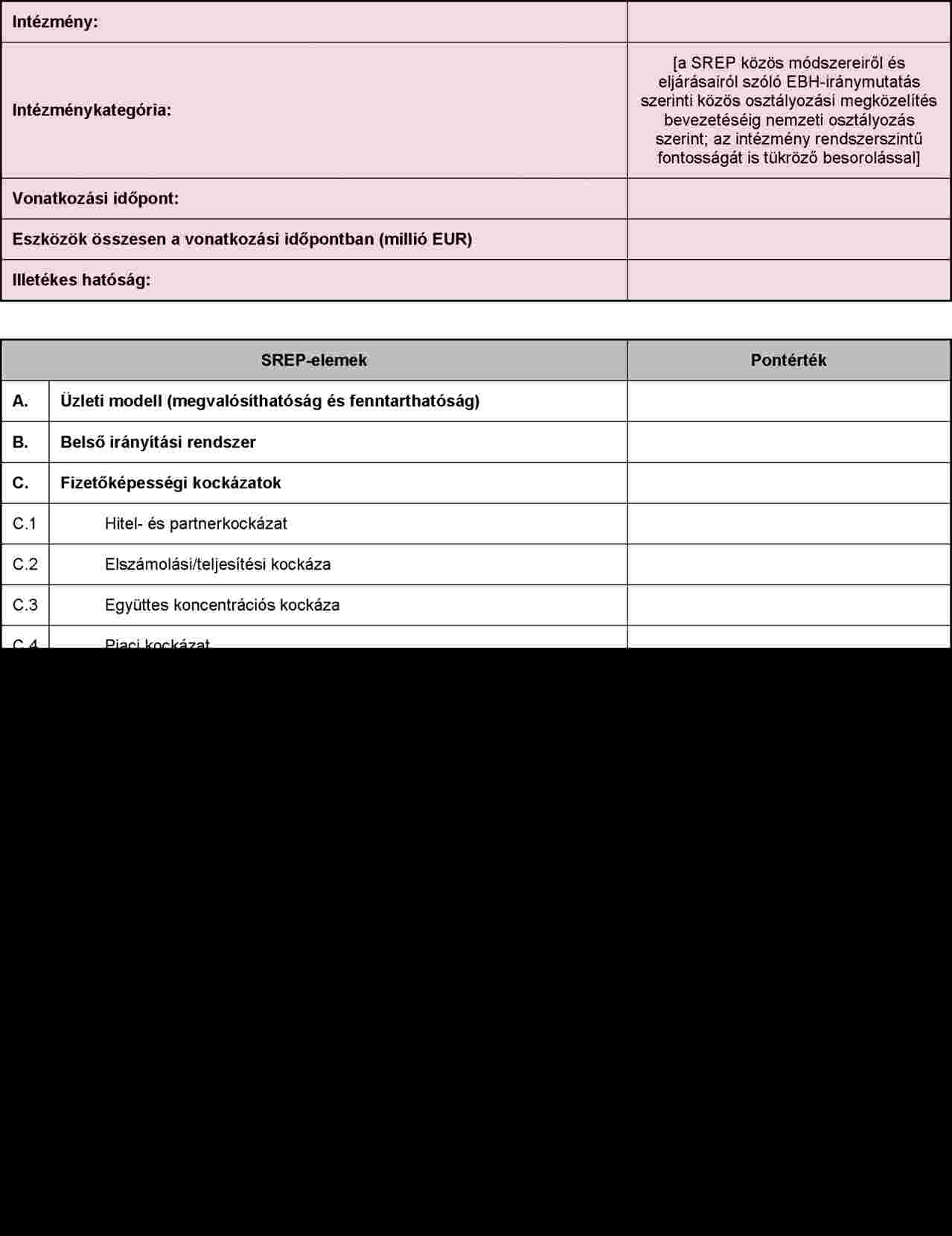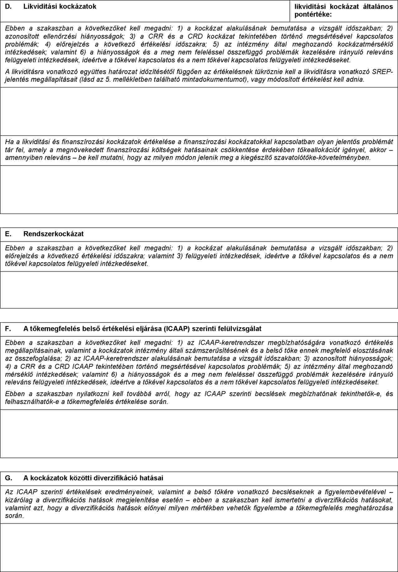 A csoport kockázatértékelését tartalmazó jelentéshez mellékletként csatolni kell az érintett illetékes hatóságok által benyújtott valamennyi SREP-jelentést. A csoport kockázatértékelését tartalmazó jelentés kiegészül a pontértékek összesítésével (1. tábla), valamint a tőkemegfelelés értékelésével (2. tábla).