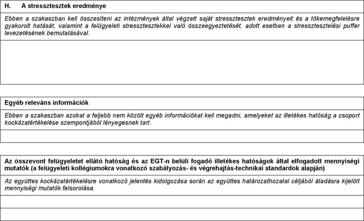 (4) A csoport kockázatértékelését tartalmazó jelentés tervezetét a III. mellékletben található tábla felhasználásával kell elkészíteni. Ezt a jelentést ki kell egészíteni a pontértékek IV. melléklet 1. táblájának használatával készült összegzésével, valamint a tőkemegfelelőség értékelésének a IV. melléklet 2. táblájának használatával készült összefoglalásával.