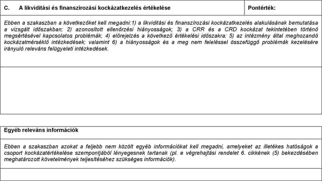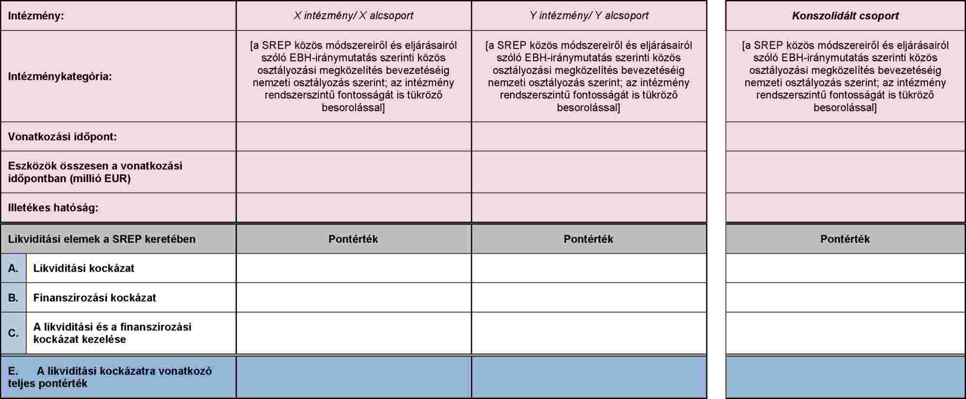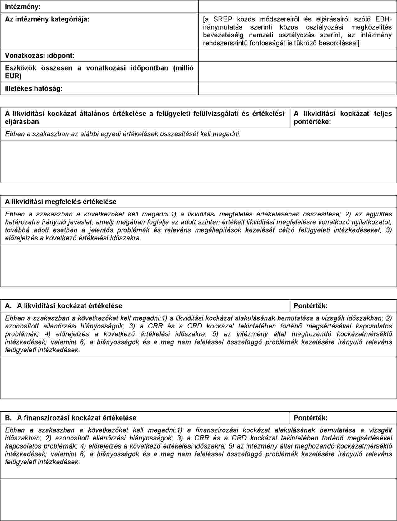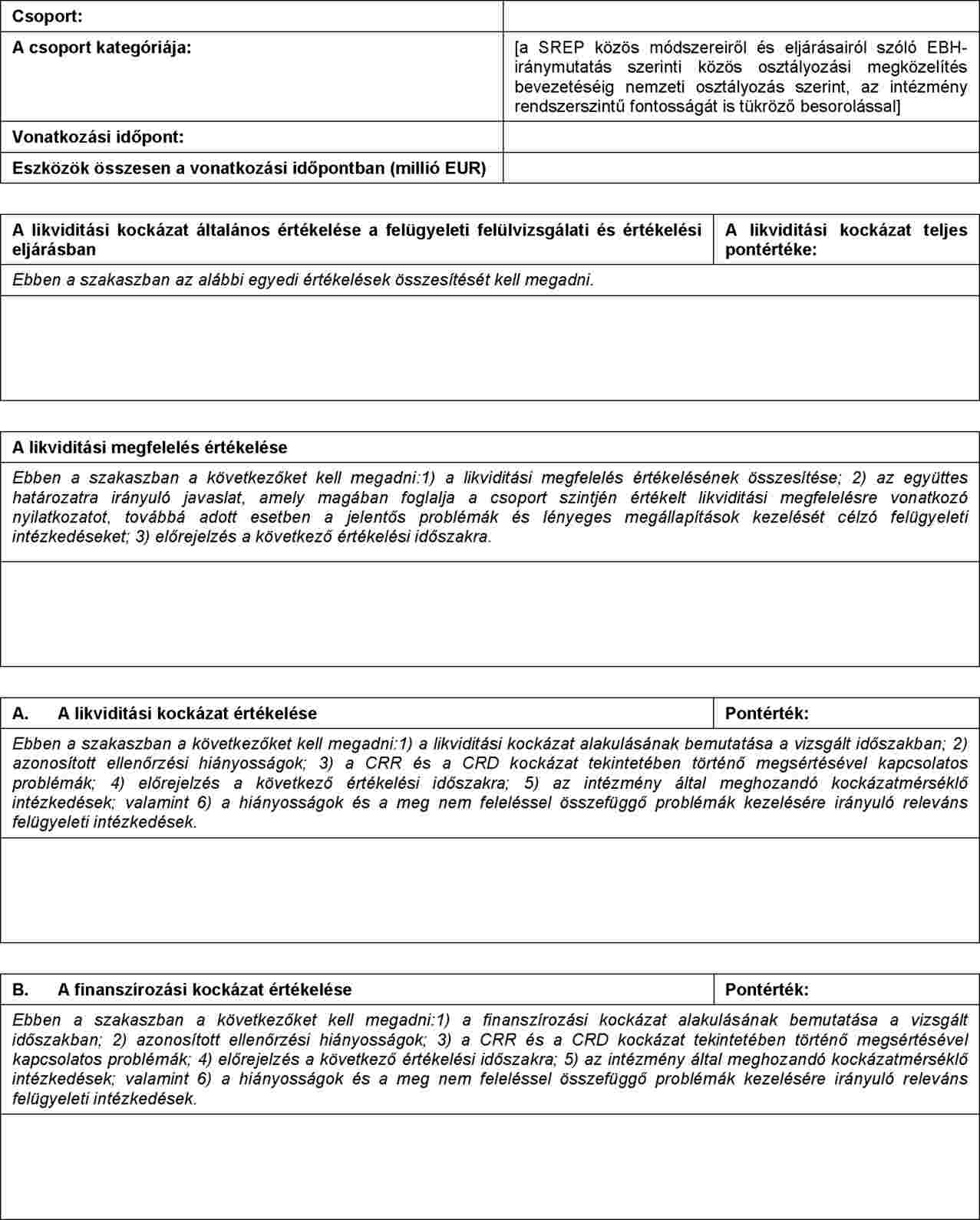 A csoport likviditási kockázatának értékelését tartalmazó jelentés tervezetét a VII. mellékletben található tábla felhasználásával kell elkészíteni. Ezt a jelentést ki kell egészíteni a pontértékek VIII. melléklet 1. táblájának használatával készült összegzésével, valamint a likviditás értékelésének a VIII. melléklet 2. táblájának használatával készült összefoglalásával.