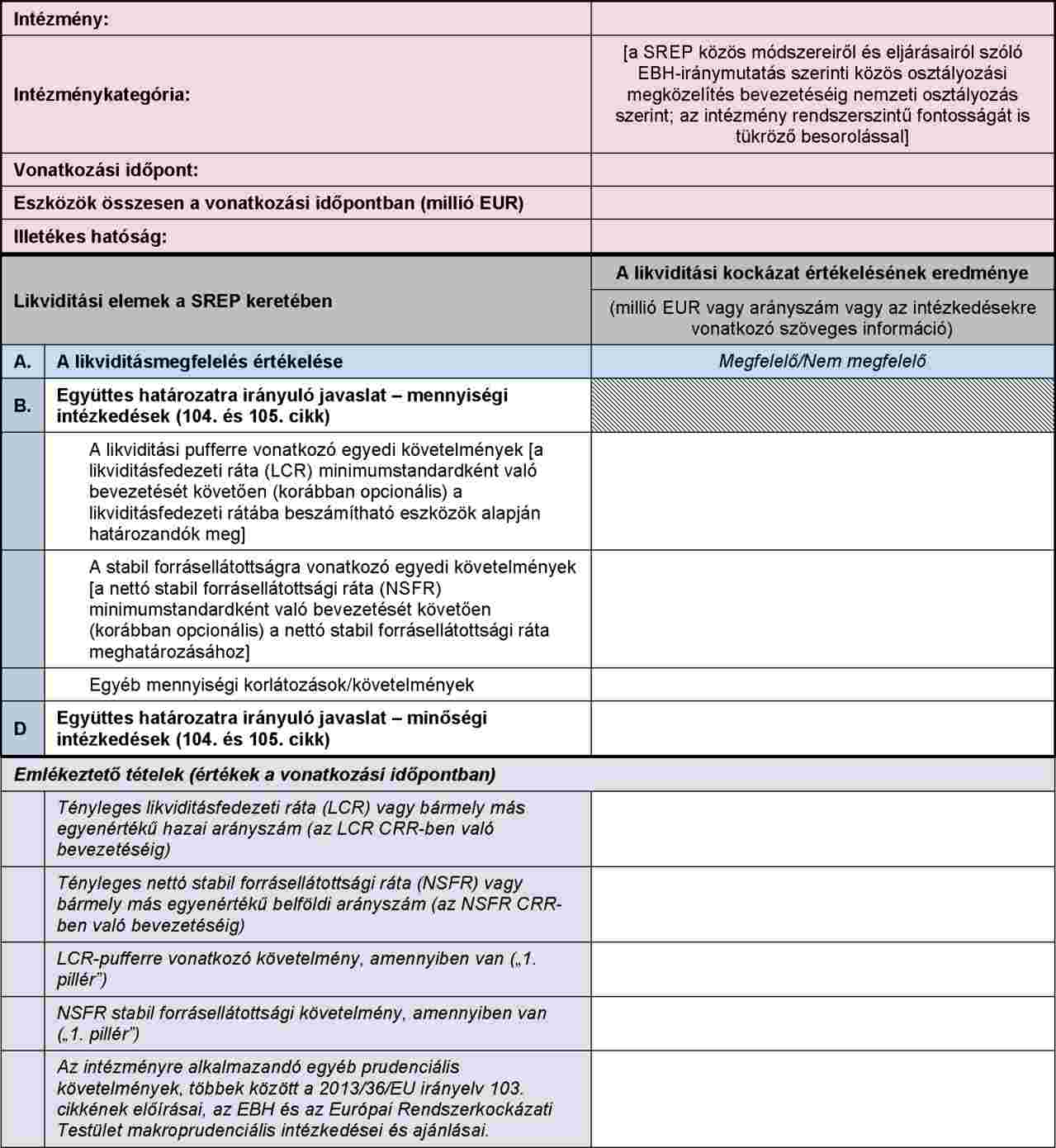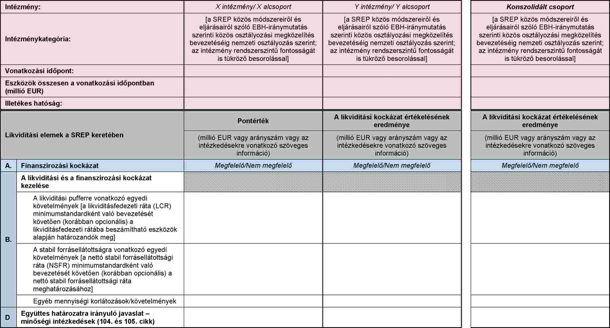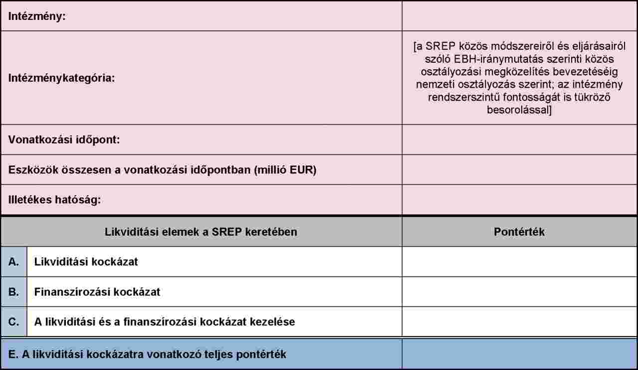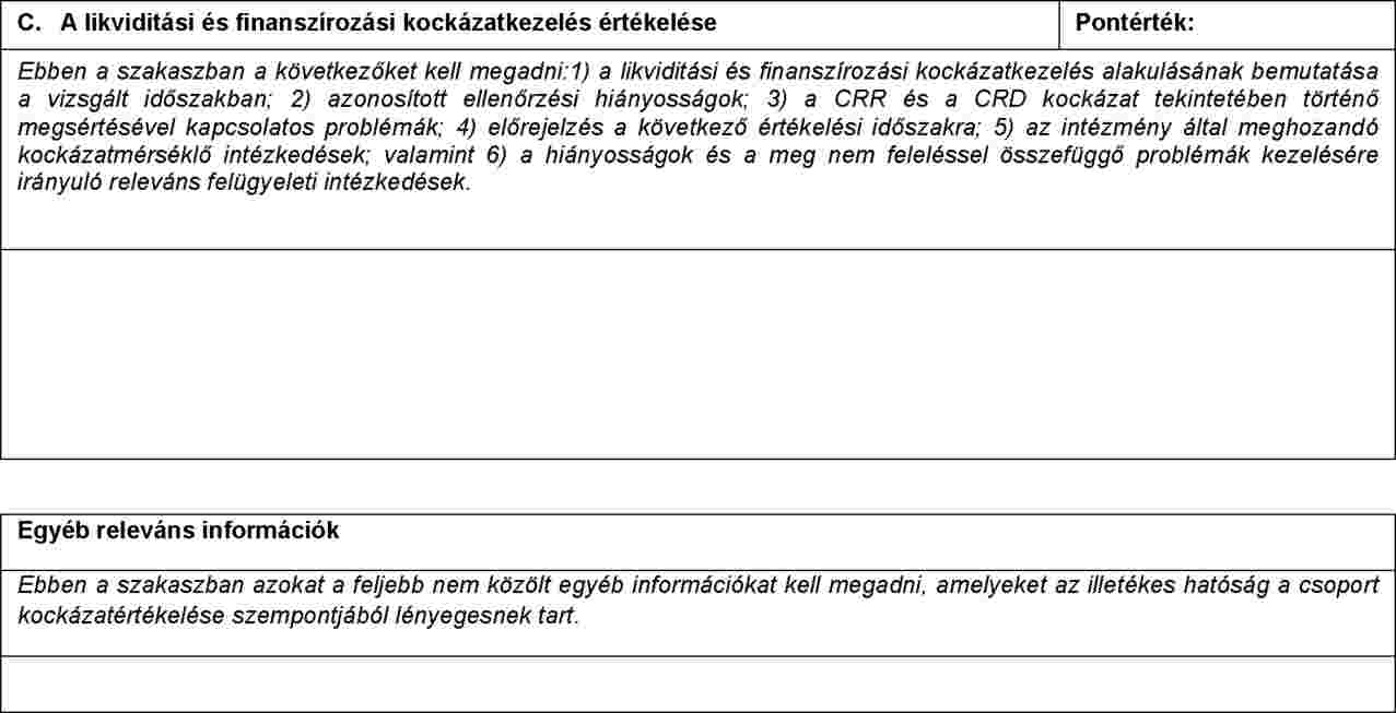 A csoport likviditási kockázatának értékelését tartalmazó jelentés tervezetét a VII. mellékletben található tábla felhasználásával kell elkészíteni. Ezt a jelentést ki kell egészíteni a pontértékek VIII. melléklet 1. táblájának használatával készült összegzésével, valamint a likviditás értékelésének a VIII. melléklet 2. táblájának használatával készült összefoglalásával.