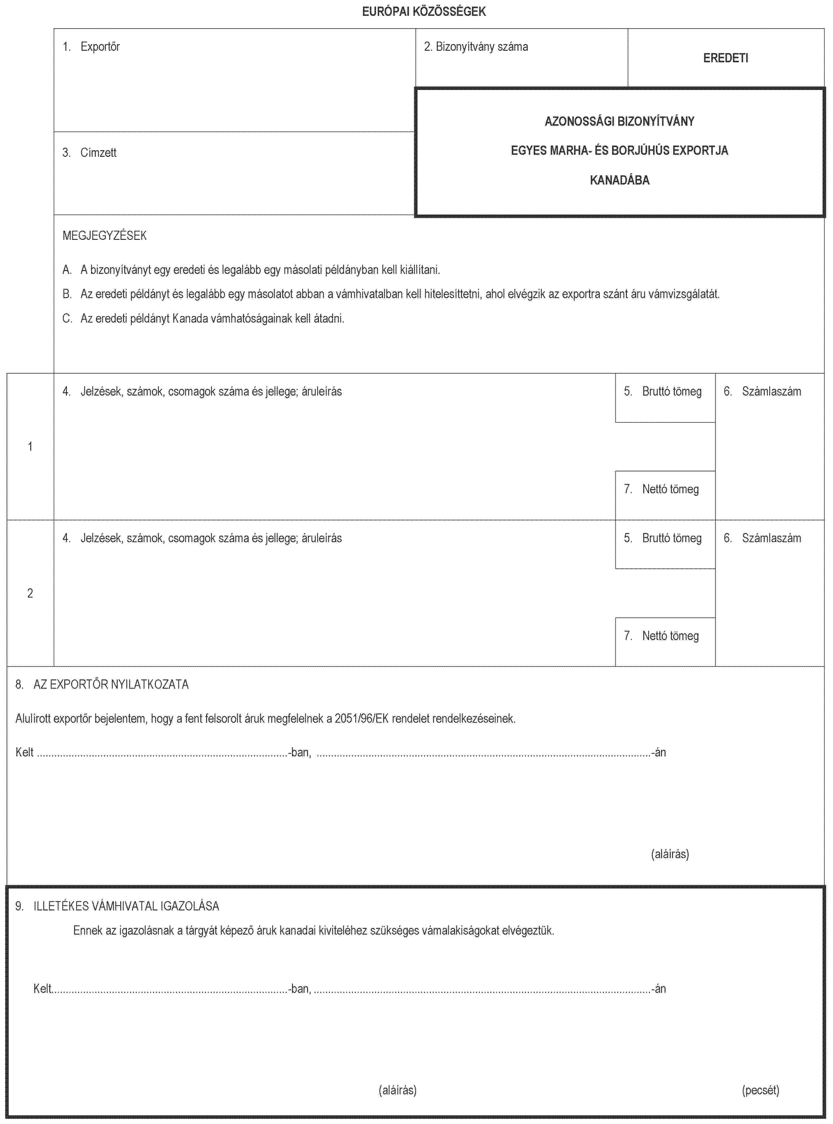 (1) Az azonossági bizonyítványt és másolatait annak a vámhivatalnak kell kiállítani, ahol az exportra szánt húst vámkezelik.