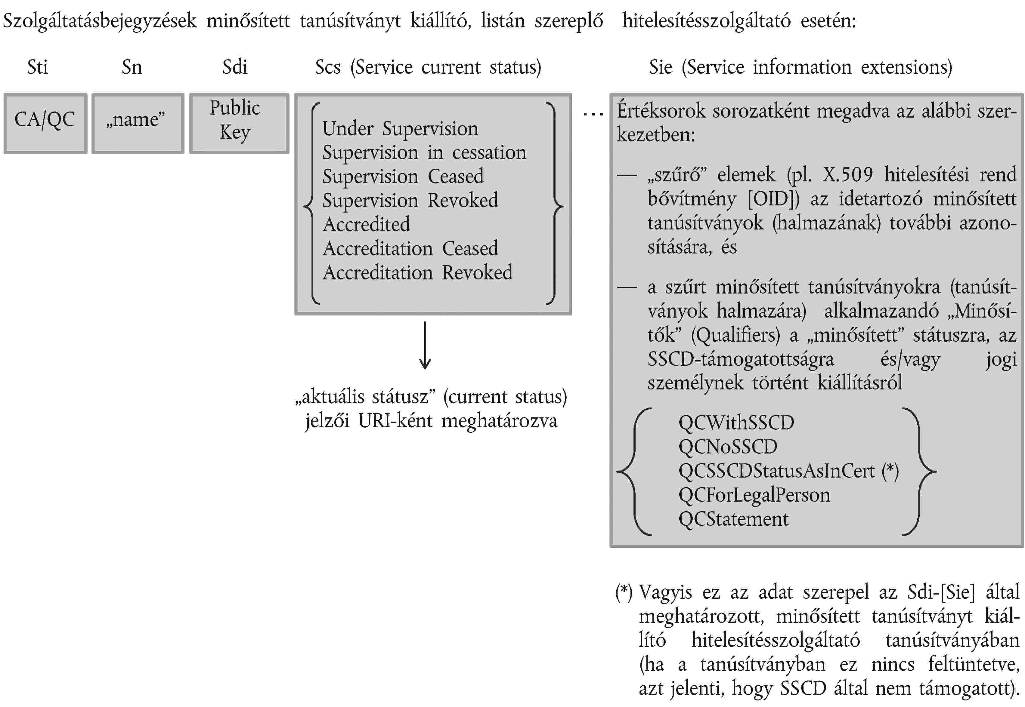 ( 14 ) Az utolsó két adatcsoport kulcsfontosságú a listát használók számára a minősített tanúsítvány kiállításával nem foglalkozó hitelesítésszolgáltatókra alkalmazott felügyeleti/akkreditációs rendszerek minőségének és biztonsági szintjének értékeléséhez. Ezeket az adatcsoportokat a megbízható szolgáltatók listája szintjén kell megadni, "a rendszer adatainak URI-ja" (Scheme information URI) (5.3.7. pont - tagállamok által megadott adatok), a "rendszertípus/közösség/szabályok" (Scheme type/community/rules) (5.3.9 pont - valamennyi tagállam esetében azonos szöveggel, és a tagállam által megadott, nem kötelező adatok révén) és a "megbízhatósági állapotlista szabályzat/jogi nyilatkozat" (TSL policy/legal notice) (5.3.11. pont - valamennyi tagállam esetében azonos, az 1999/93/EK irányelvre utaló szöveg, azzal, hogy minden tagállam feltüntetheti a tagállamra jellemző egyedi szöveget/hivatkozásokat) mezők használatával. A minősített tanúsítvány kiállításával nem foglalkozó hitelesítésszolgáltatók nemzeti felügyeleti/akkreditációs rendszerének szintjén meghatározott további adatokat szükség esetén (pl. több minőségi/biztonsági szint megkülönböztetése érdekében) szolgáltatási szinten lehet megadni "a rendszer szolgáltatásai meghatározásának URI-ja" (Scheme service definition URI) (5.5.6. pont) mező használatával.