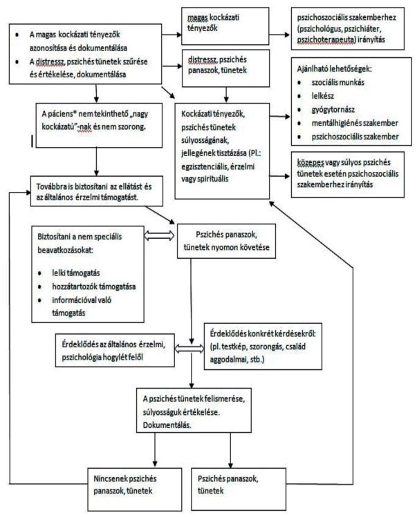 | korábbi pszichológiai, pszichiátriai anamnézis, pszichoszociális rizikófaktorok szűrése | önálló | koordinátor, ápolók, orvos, pszichoszociális szakember | |