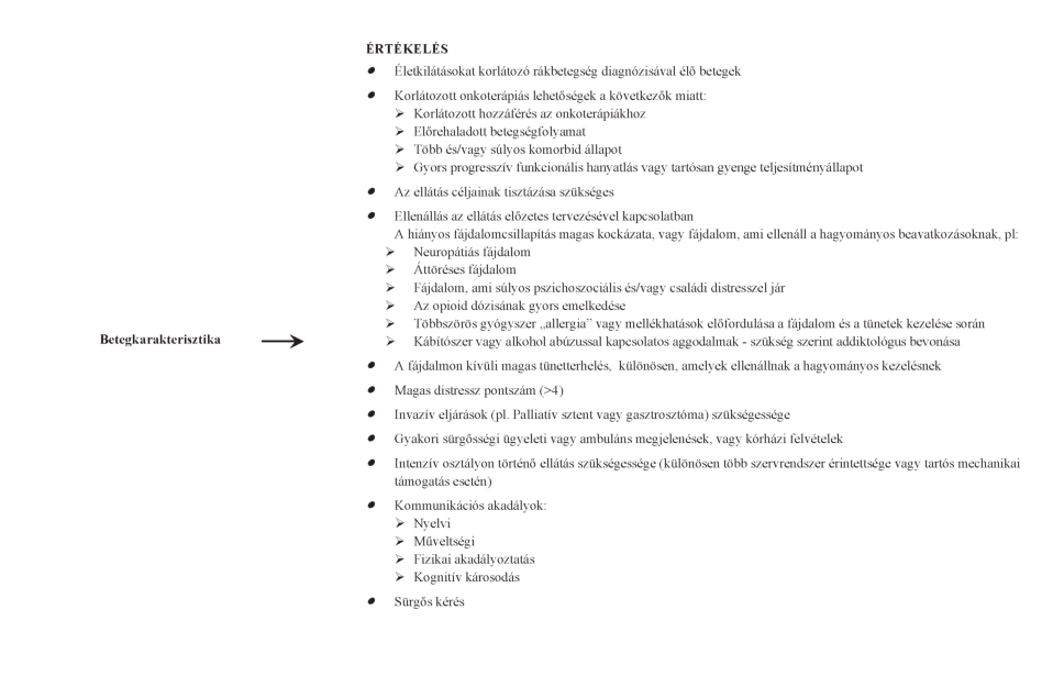 Ellátási folyamat szakasza(i): A palliatív ellátás szervezése, valamint klinikai vonatkozásban terápia és gondozás, azon belül: orvosi, ápolói, pszichoszociális, fizioterápiás gondozás.