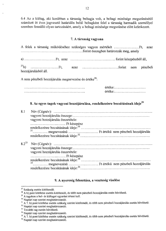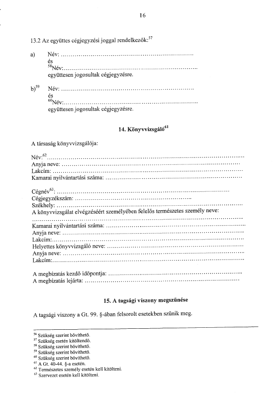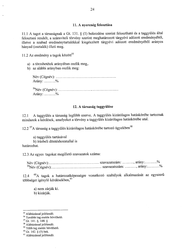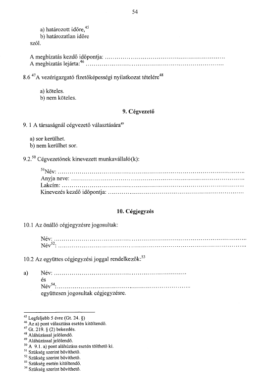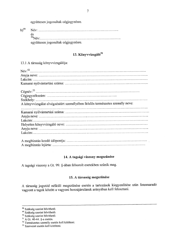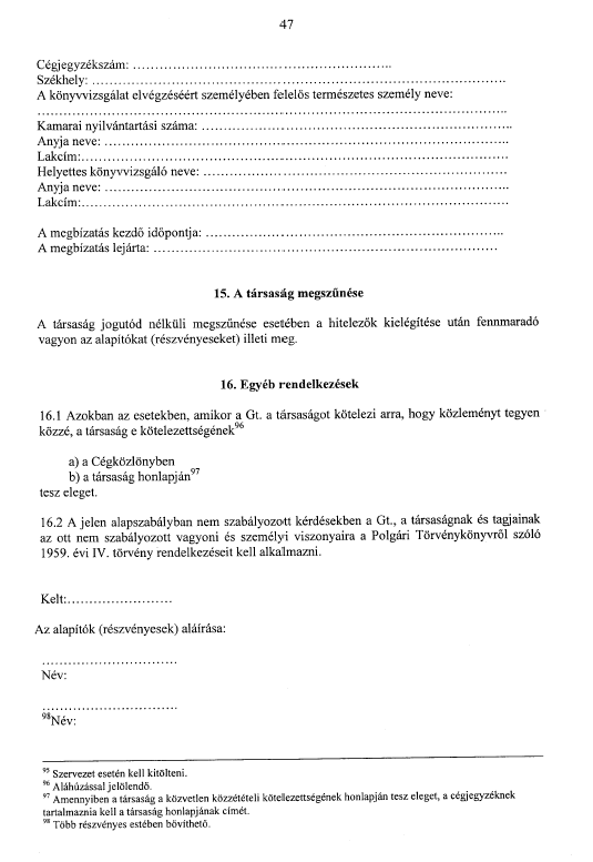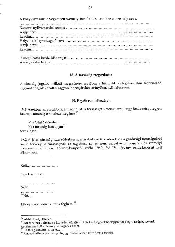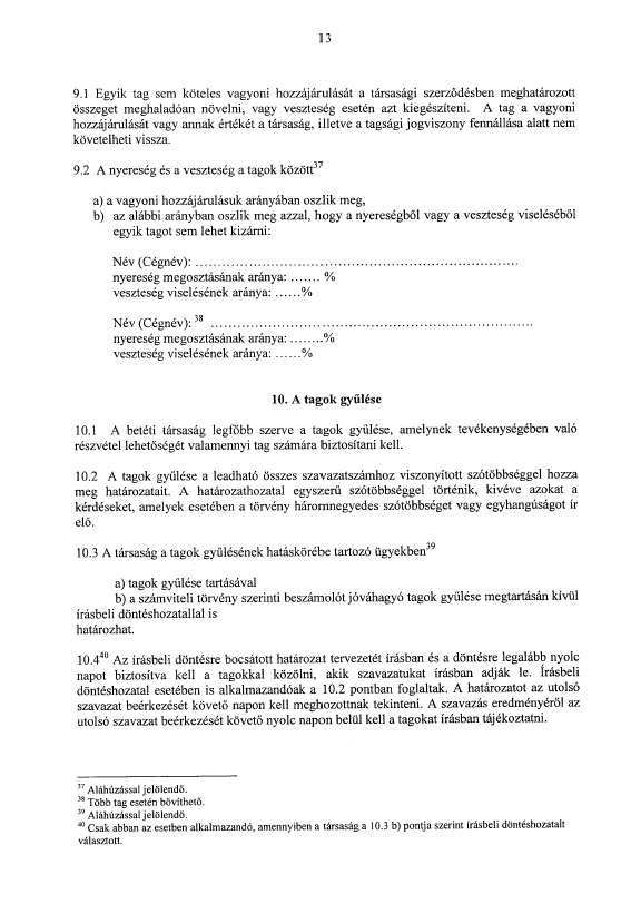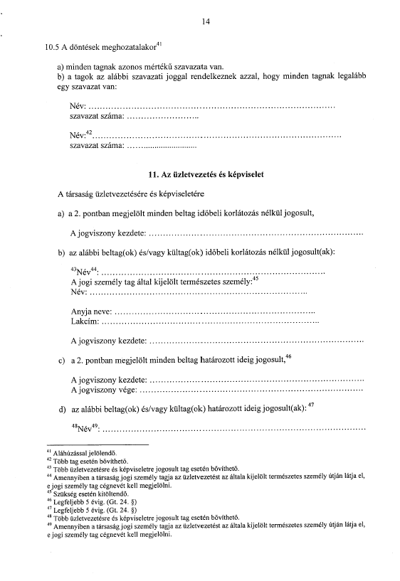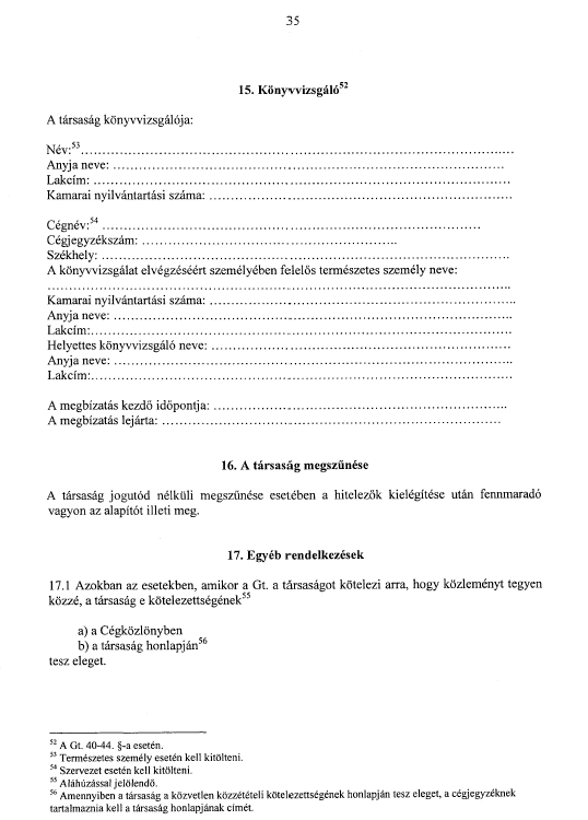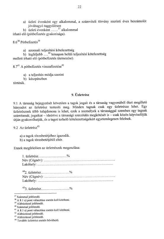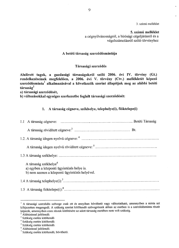 A Javaslattal módosításra kerülő Ctv. 48. §-ának (1) bekezdése, illetve a felülvizsgált szerződésminták szövege alapján kétségtelen, hogy amennyiben a Ctv . mellékletét képező szerződésmintából akár elhagynak, akár ahhoz hozzátesznek rendelkezéseket, pontokat, a szerződés már nem tekinthető szerződésmintának. Ilyen hatályú elhagyásnak minősül az is, ha a szerződésből kizárólag a szerződésmintára való utalás kerül ki, illetve, ha azon kitölthető szövegrészek nem képezik a szerződés részét, amelyek bár a törvényi minta részei, azonban az adott társaság esetében nem kerülnek kitöltésre . Így, ha a szerződésből elhagyják például a cég fióktelepére vonatkozó pontot - abból a megfontolásból, hogy a cégnek nincs fióktelepe - a szerződés nem tekinthető szerződésminta alkalmazásával készült szerződésnek. A helyes eljárás ezen utóbbi esetben az, ha a minta kitöltése során e pontot nem töltik ki, vagy a kipontozott részében "-" jelzéssel jelölik, hogy nincs fióktelepe a cégnek.