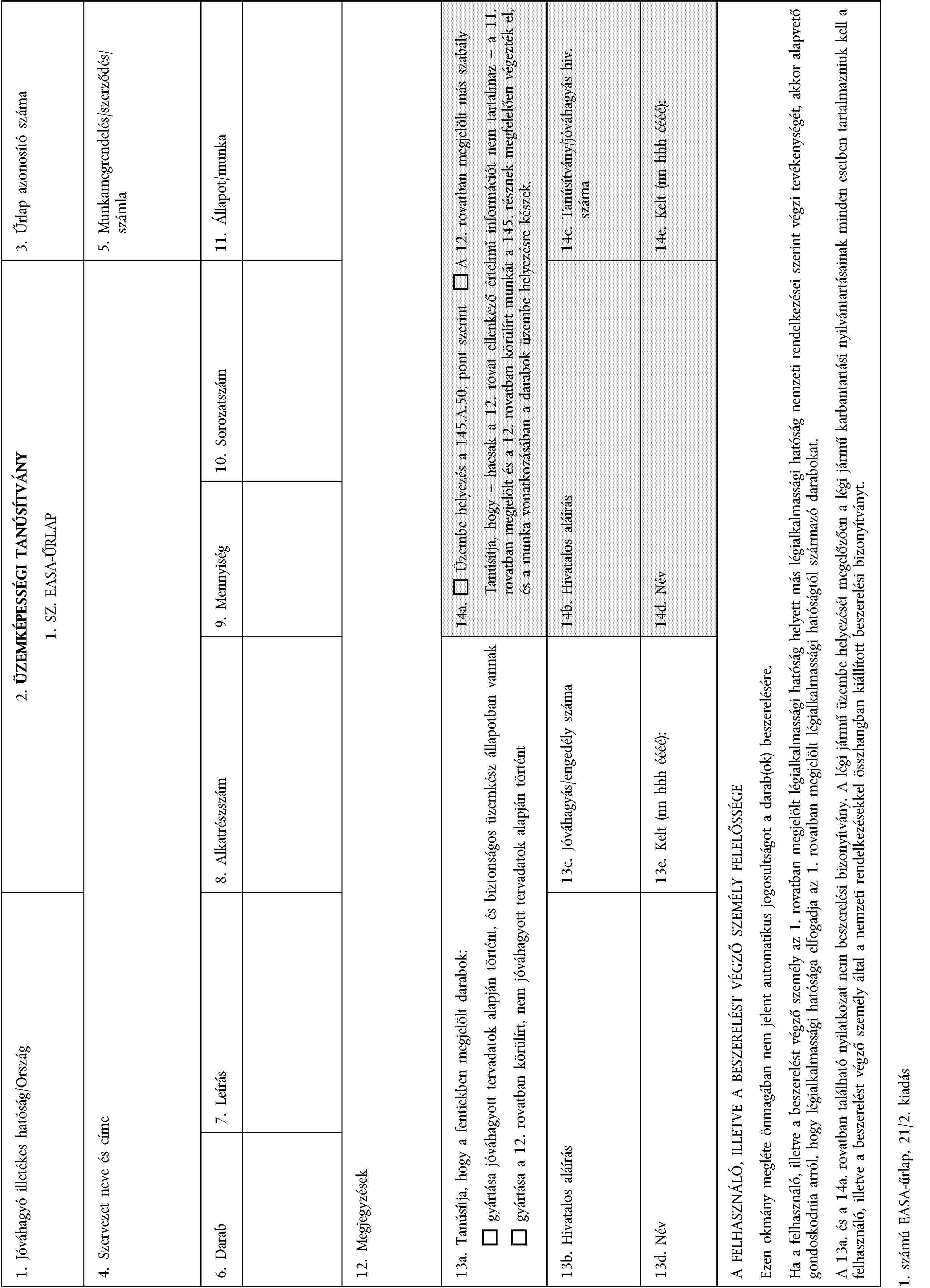"a) Csatoltak hozzá üzemképességi tanúsítványt (1. számú EASA-űrlap), amely igazolja, hogy a darab gyártása jóváhagyott tervadatoknak megfelelően történt, és a darab biztonságos üzemkész állapotban van; valamint".