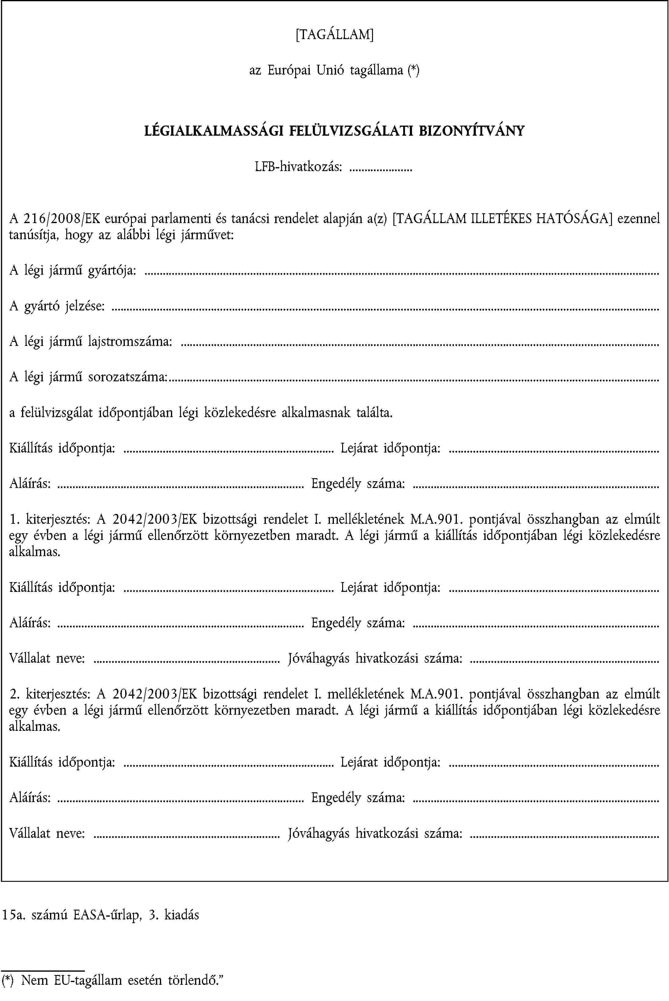 (1) Vagy »EASA«, ha az EASA az illetékes hatóság. (2) Nem EU-tagállam esetén törlendő. (3) A nem kívánt rész törlendő. |