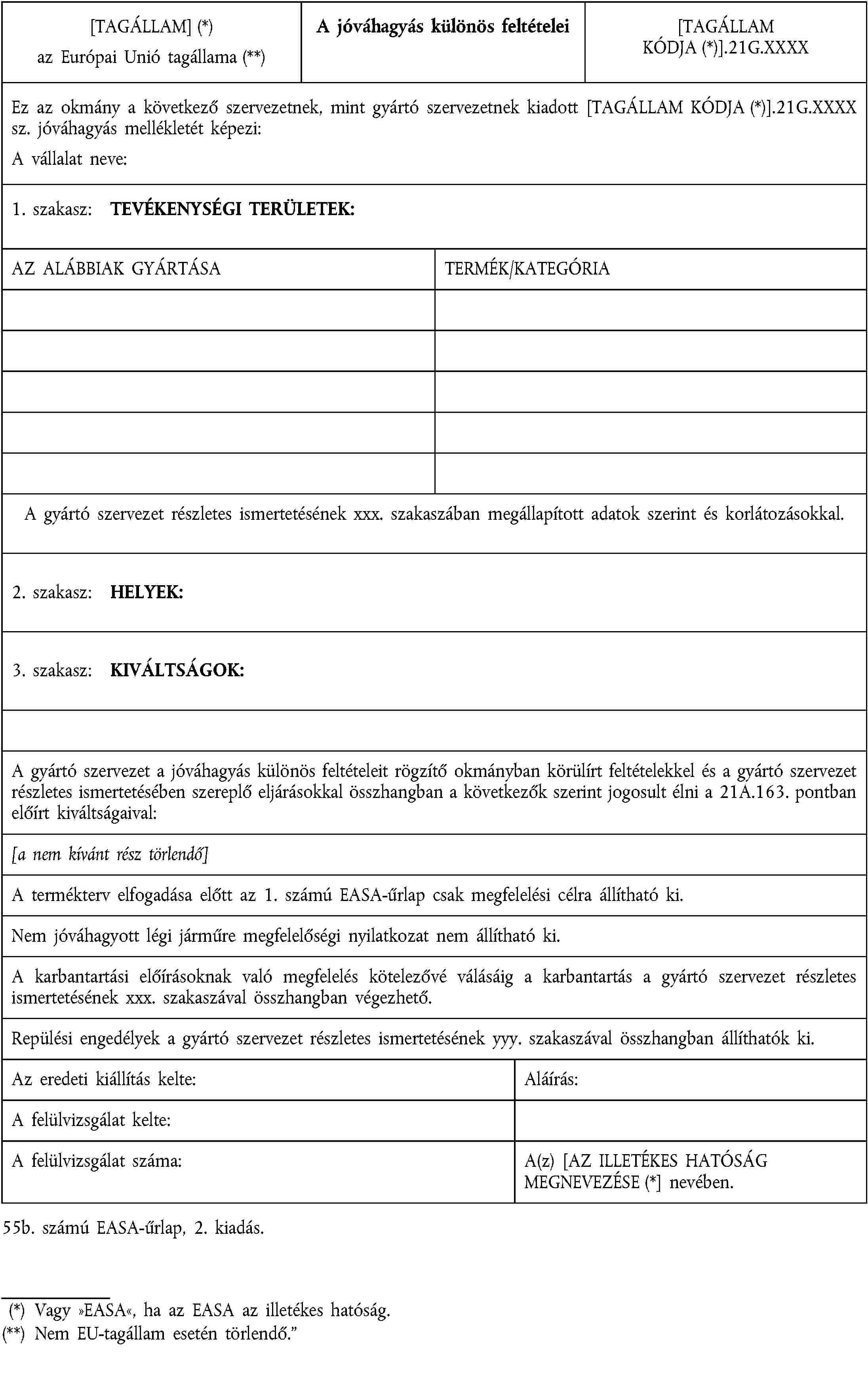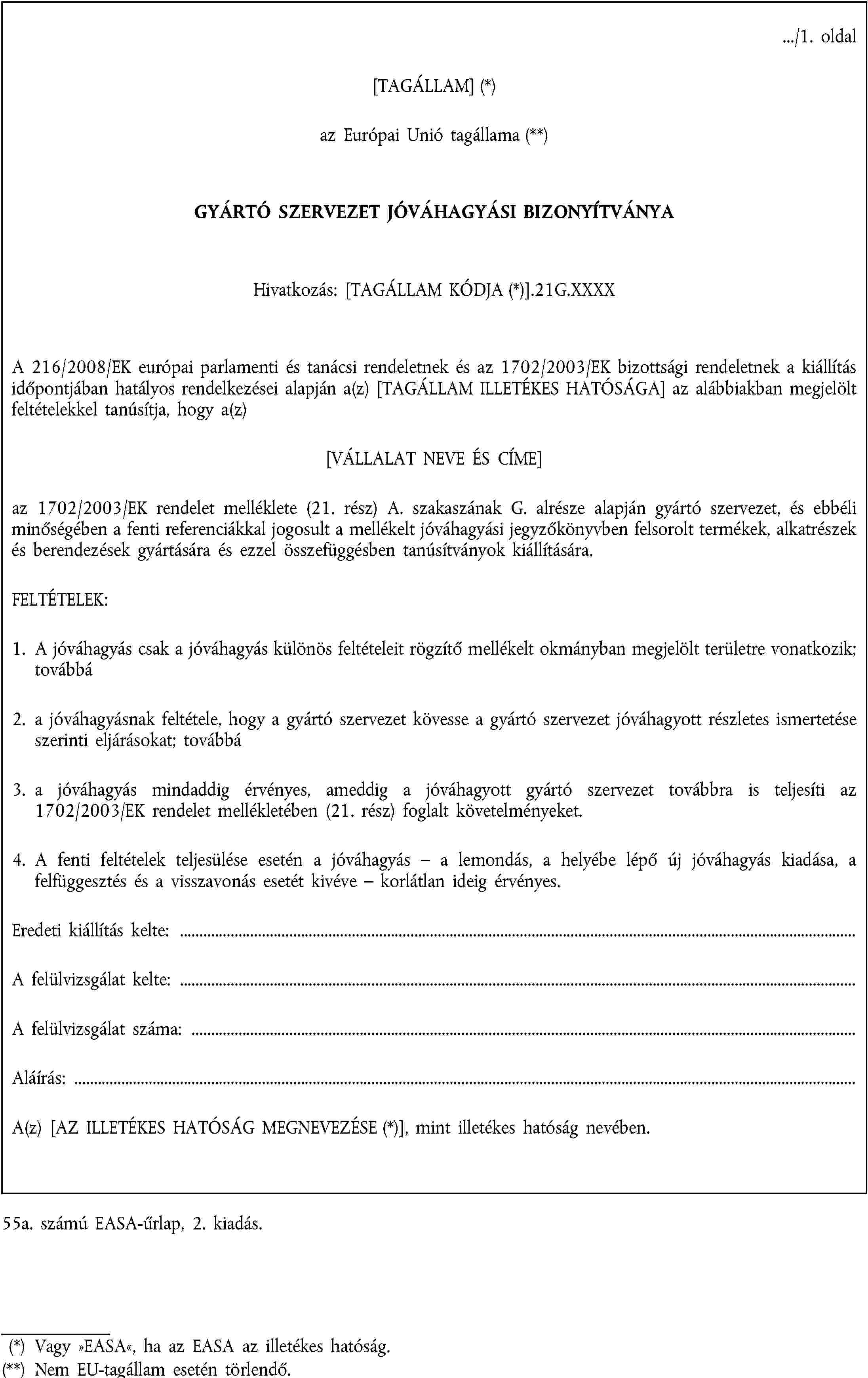 Gyártó szervezet jóváhagyási bizonyítványai a melléklet (21. rész) G. alrésze szerint - 55. számú EASA-űrlap