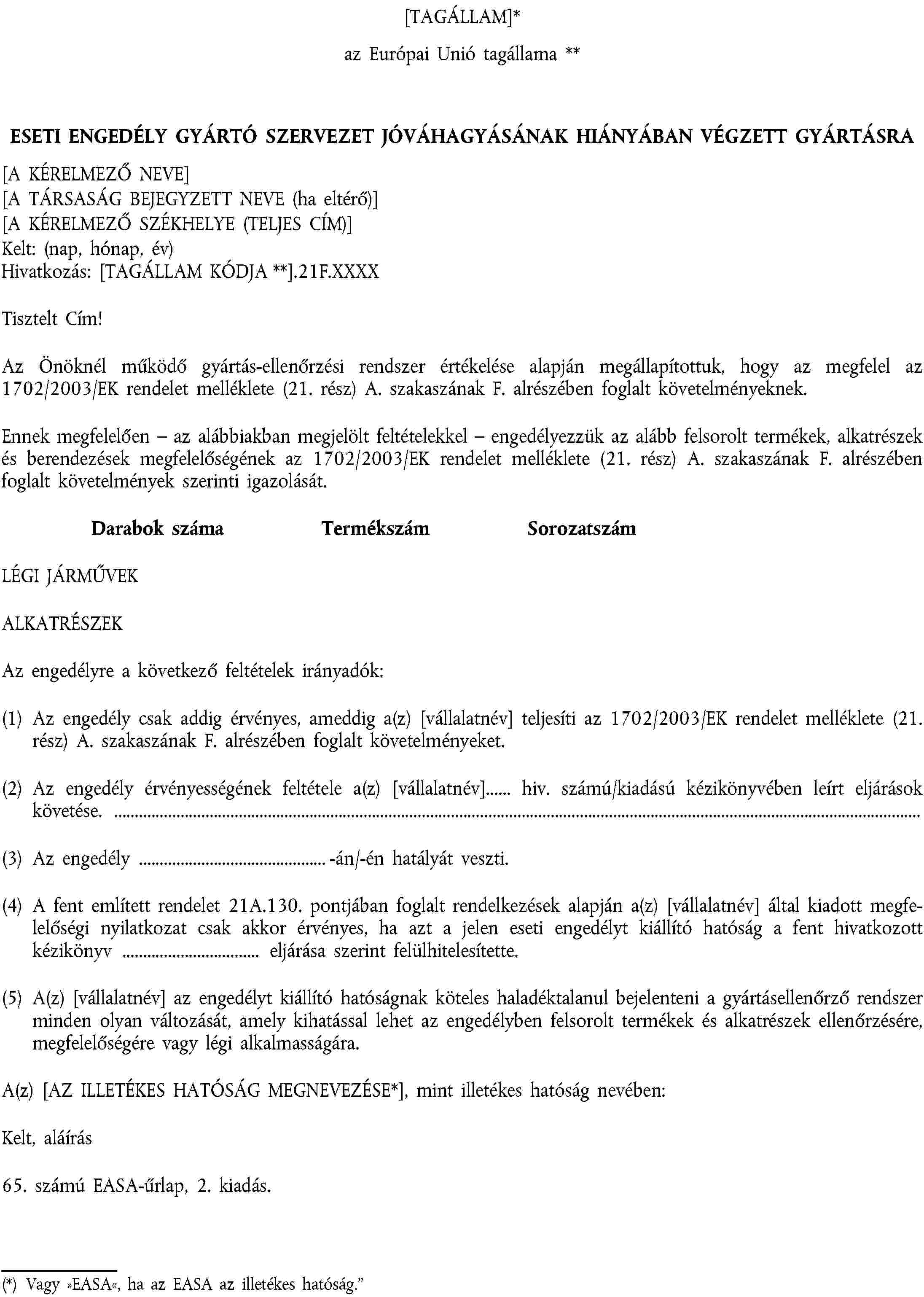 Eseti engedély - 65. számú EASA-űrlap - a melléklet (21. rész) F. alrésze szerint