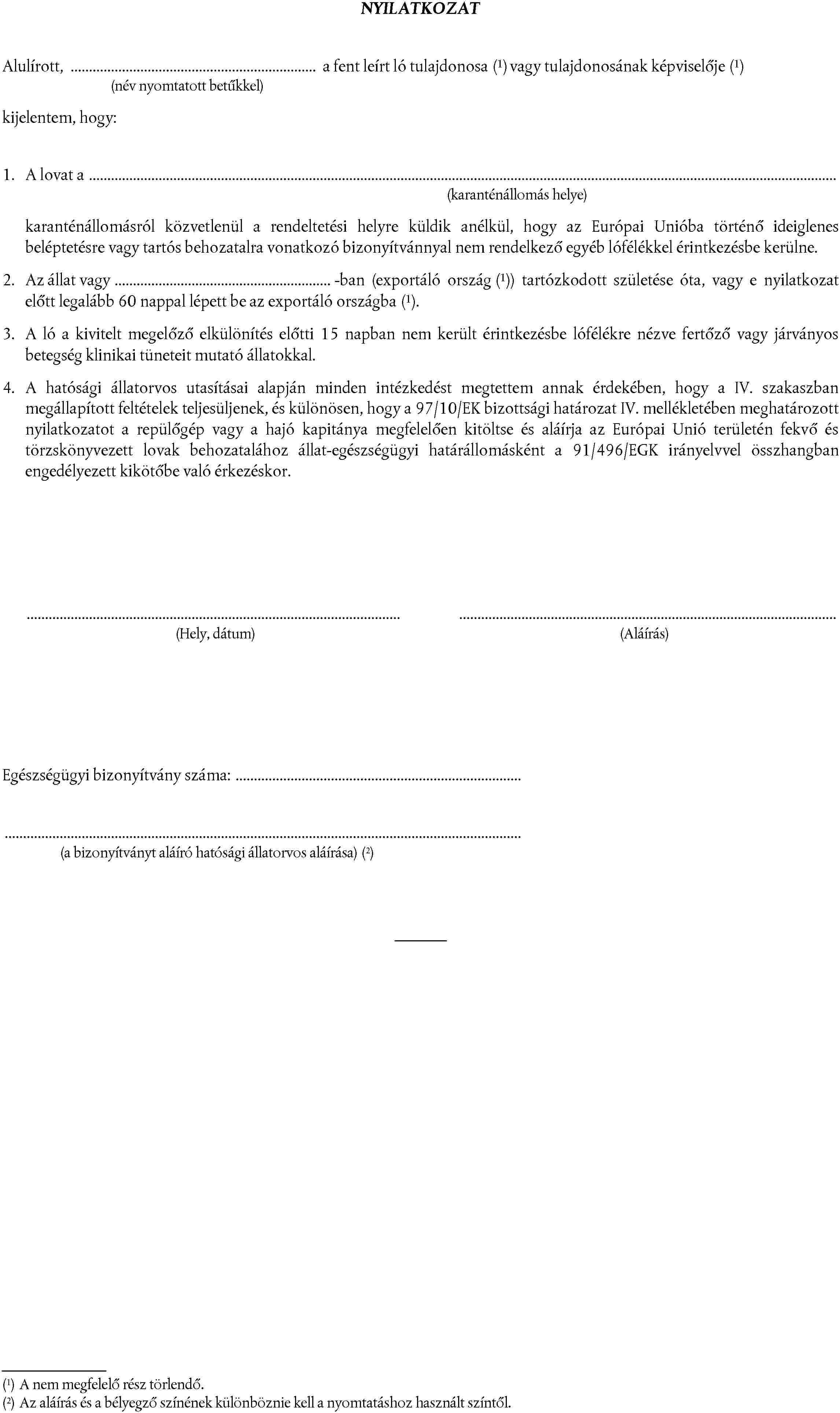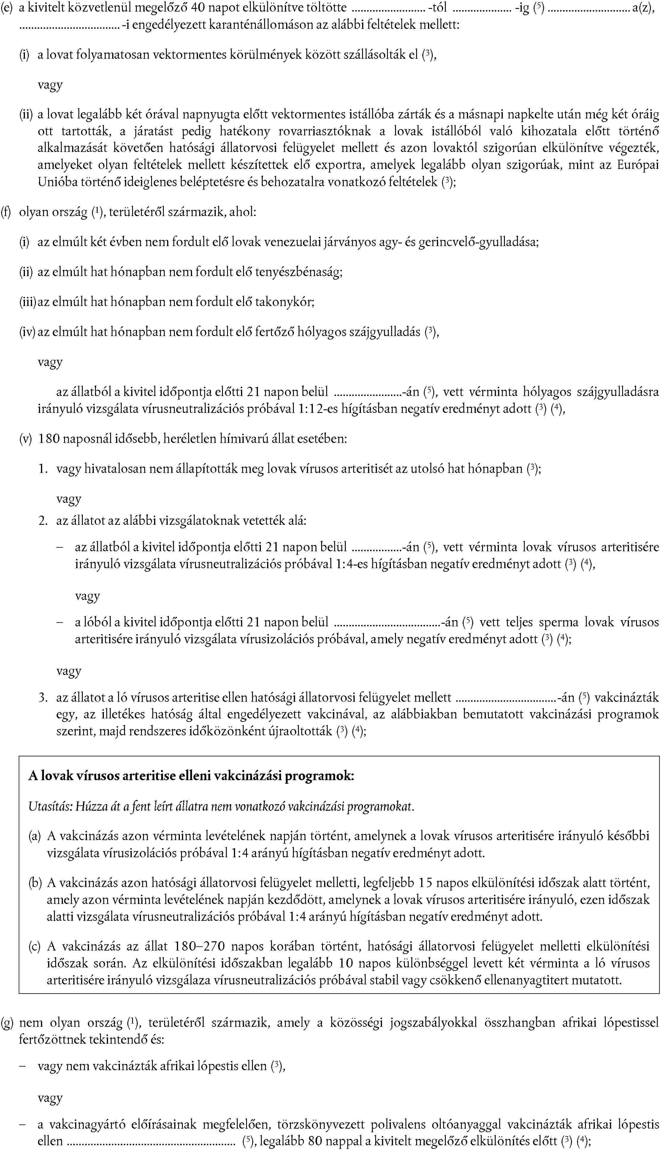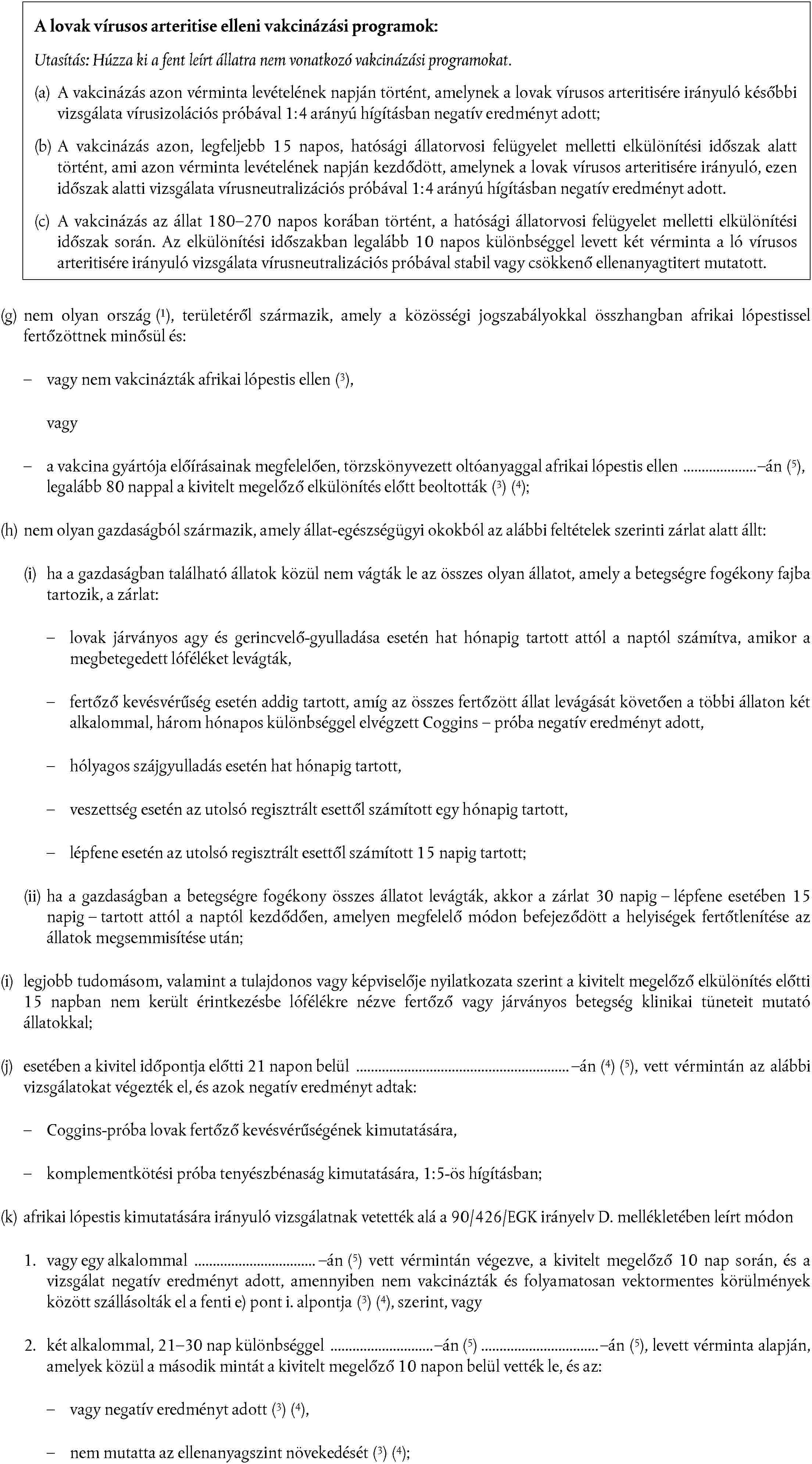 (5) Továbbá a törzskönyvezett lovak betegségtől mentes területre történő szállítását szükséges engedélykötelessé tenni olyan esetekben, amikor a lovakat nem vakcinázták, vagy állat-egészségügyi okokból a vakcinázás során nem tartották be a gyártó valamennyi utasítását.