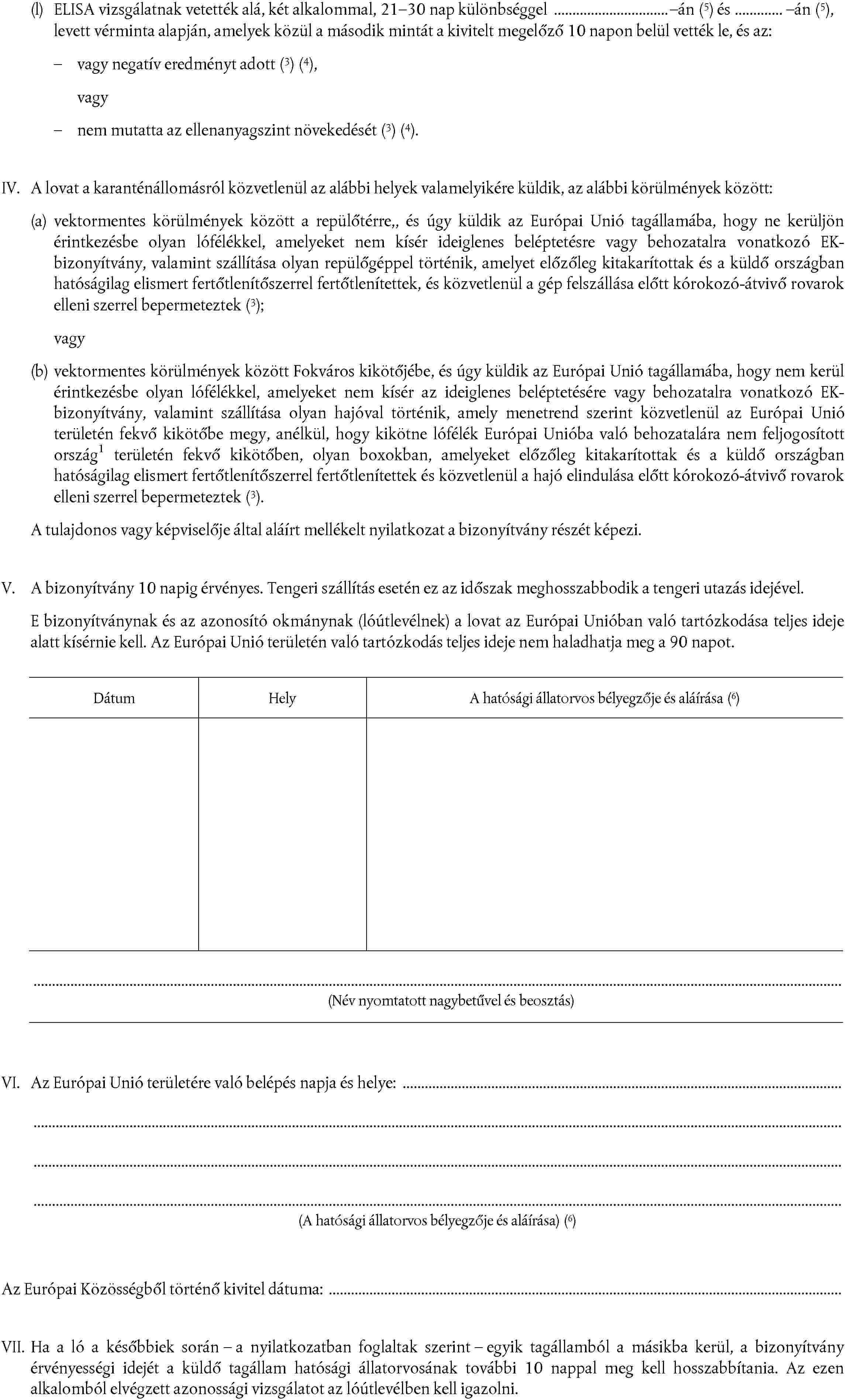 (4) E kiegészítő garanciák megtiltják az afrikai lópestis elleni vakcinázást az afrikai lópestistől mentes területen. Ebből következően azon törzskönyvezett lovak vakcinázási státuszát, amelyek több mint 24 hónapot tartózkodtak az afrikai lópestistől mentes területen, többé nem lehet a jelenlegi behozatali feltételek alapján igazolni.