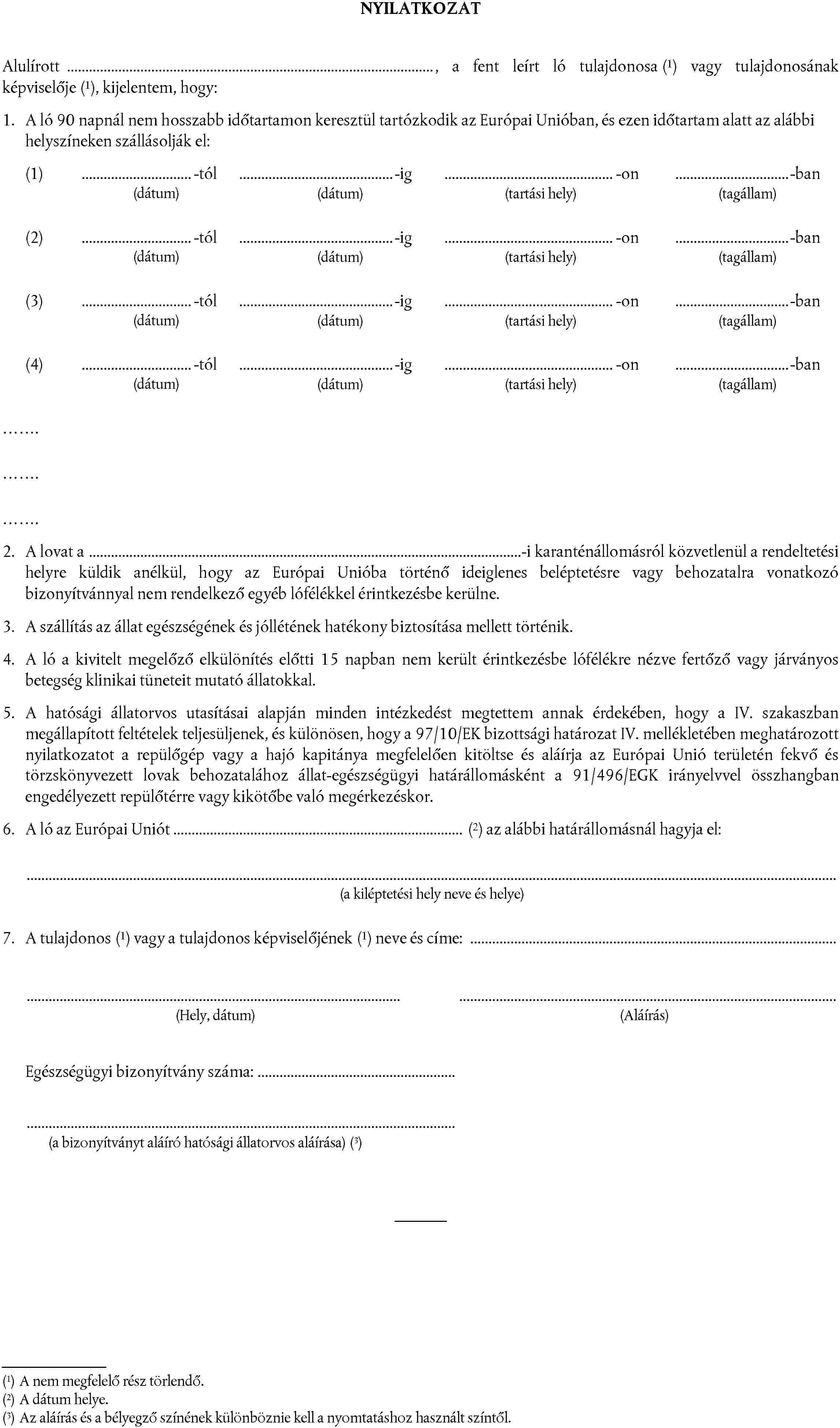 (1) A 92/260/EGK bizottsági határozat ( 2 ) megállapítja a törzskönyvezett lovak ideiglenes beléptetésére vonatkozó állat-egészségügyi feltételeket és az állatorvosi bizonyítvány kiállítását.