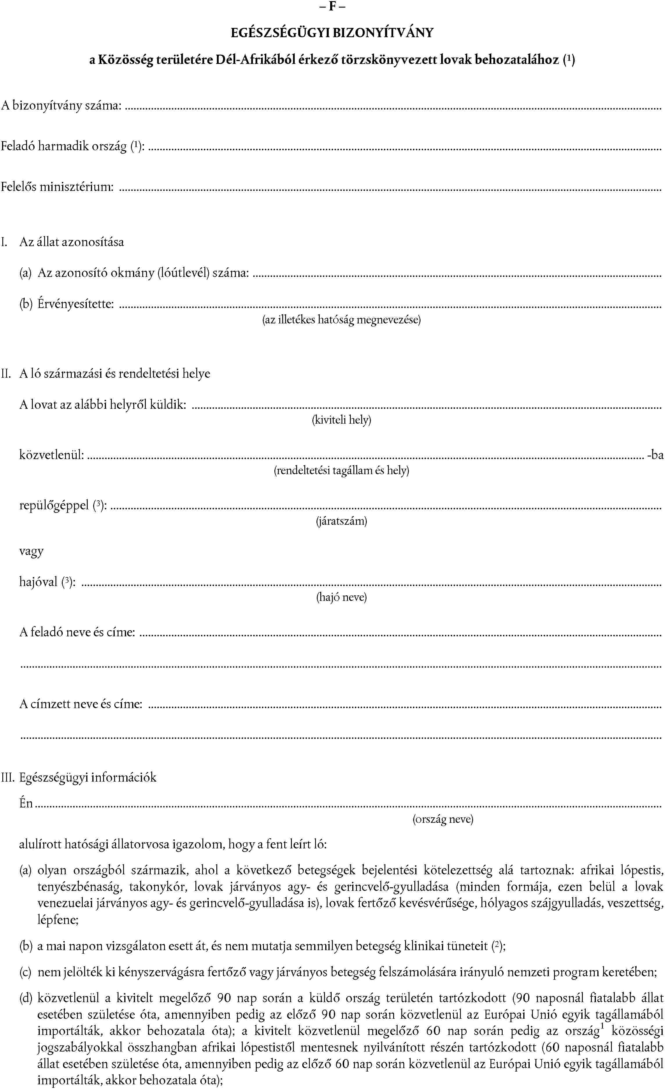 A 92/260/EGK határozat II. mellékletében az "F" állatorvosi bizonyítvány helyébe e határozat I. mellékletének szövege lép.