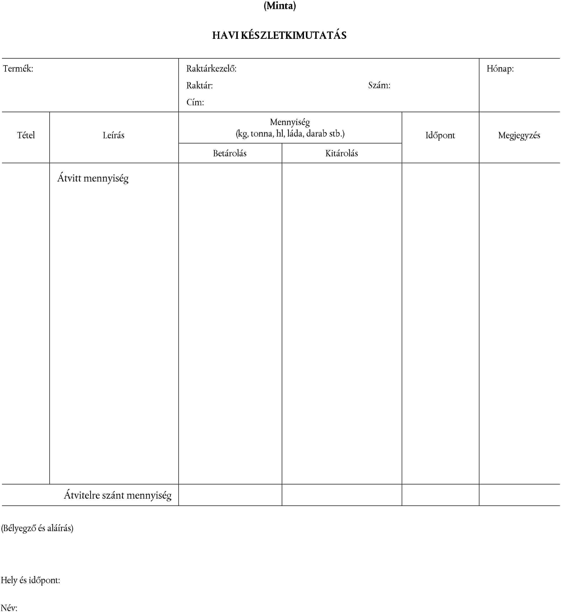 (2) Az éves készletkimutatás, amelynek űrlapmintáját iránymutatásként a II. melléklet tartalmazza, termékre és raktározási helyre lebontva összefoglalja a raktáron lévő mennyiségeket, továbbá minden egyes termékre megadja a raktáron lévő mennyiségeket, a tételek számát (a gabonafélék kivételével), a betárolás évét (a szesz kivételével) és magyarázatot minden észlelt rendellenességre.
