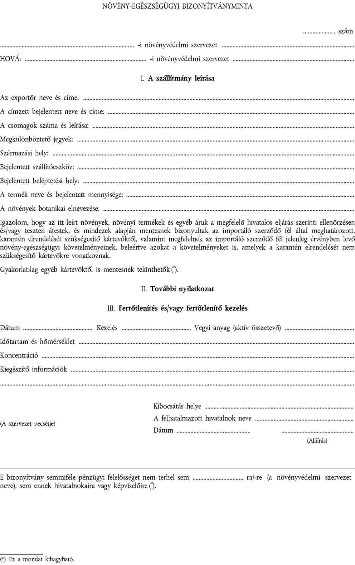 (2) Az ENSZ Élelmezési és Mezőgazdasági Szervezetén (FAO) belül 1951. december 6-án kötött nemzetközi növényvédelmi egyezmény (IPPC) melléklete bizonyítványmintákat határoz meg. Ezek szabványmegfogalmazást és formátumot nyújtanak, amelyeket követni kell a bizonyítványok előkészítésekor és kibocsátásakor.