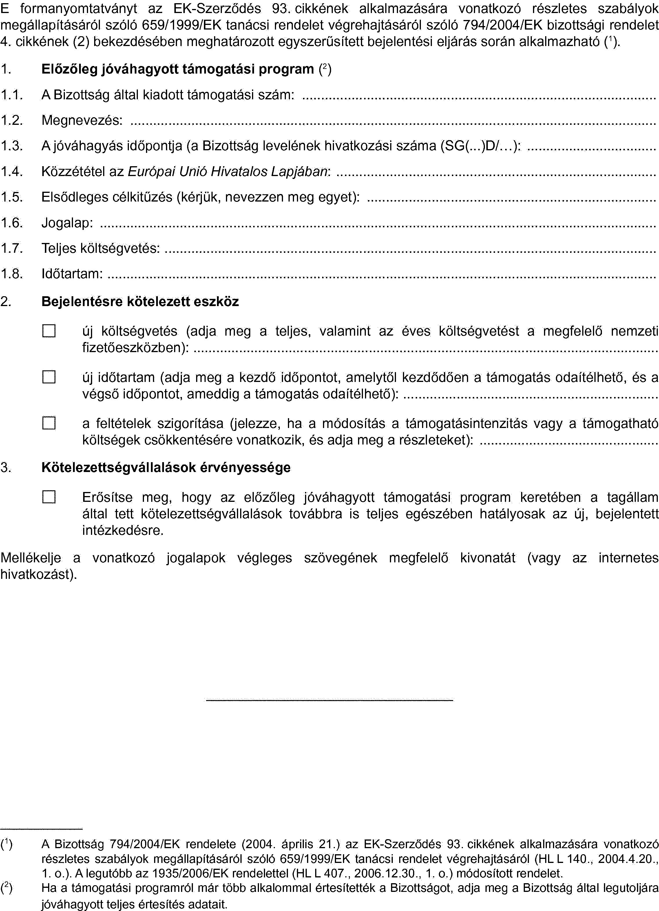 Az intézkedésnek állami támogatásra vonatkozó rendeletekkel, iránymutatásokkal, keretszabályokkal és egyéb szövegekkel összhangban történő értékeléséhez szükséges kiegészítő információkat az I. melléklet III. részében meghatározott kiegészítő adatlapokon kell szolgáltatni.