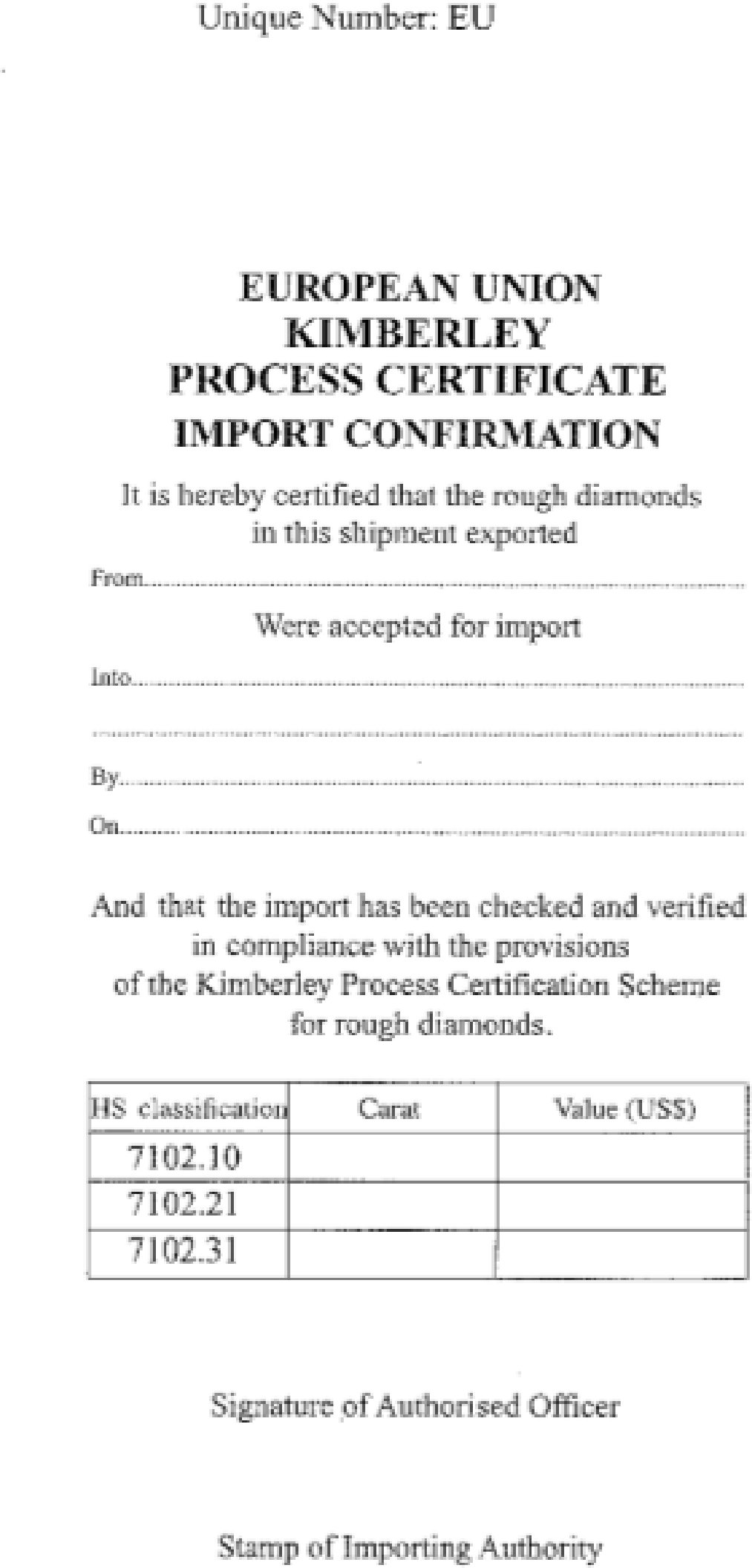 Ezekben az esetekben az érintett közösségi hatóság az importőr részére a szabályszerű importról megerősítést bocsát ki, amely szerint a gyémántokat a 3. cikk feltételeinek megfelelőnek tekinti.