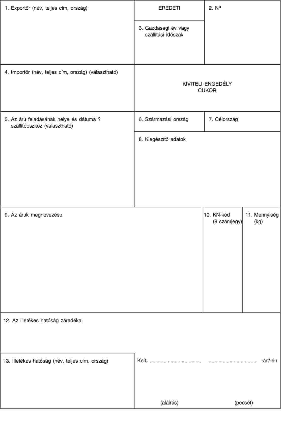 b) a kedvezményezett exportáló ország hatóságai által kiadott kiviteli engedély eredeti példányát (amely megfelel a mellékletben található mintának), a behozatali engedély iránti kérelemben megadott összeggel megegyező összegre;
