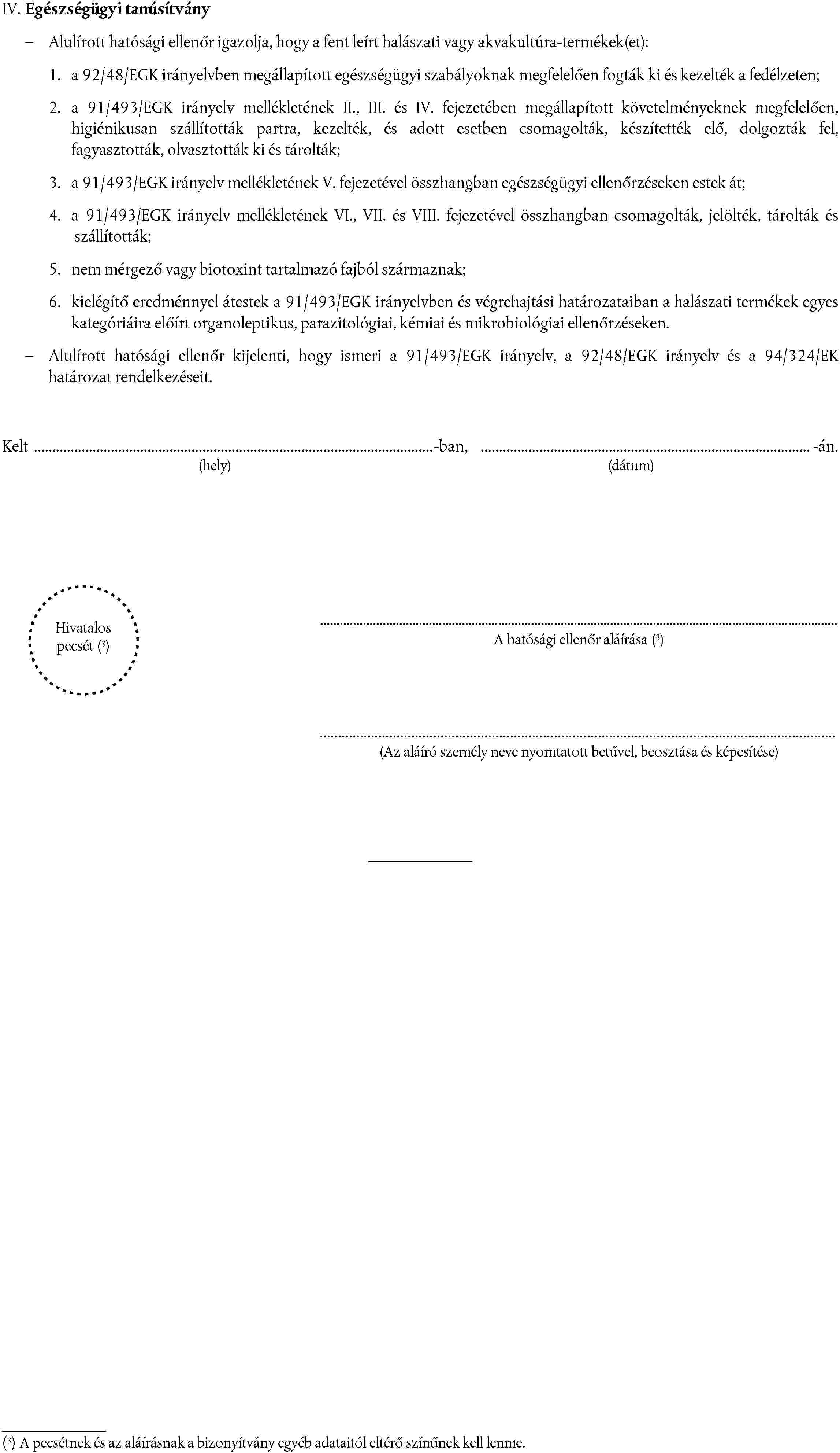 mivel a 91/493/EGK irányelv 11. cikke (4) bekezdésének a) pontjában említett egészségügyi bizonyítvány megszerzésére vonatkozó eljárásnak ki kell terjednie egy bizonyítványminta meghatározására, a kiállítás nyelvére/nyelveire vonatkozó minimumkövetelményekre, valamint a bizonyítvány aláírására jogosult személy beosztására;