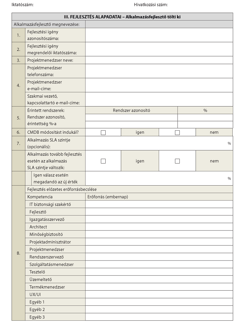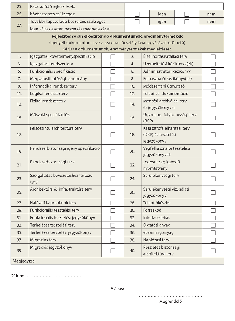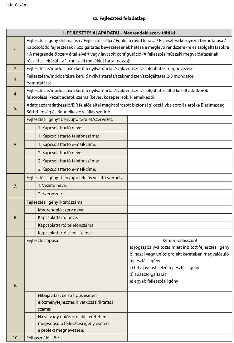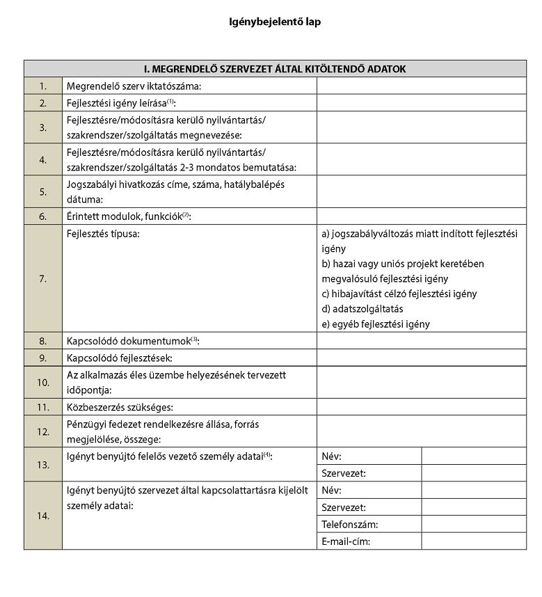 (2) A fejlesztési folyamat az igény felmerülésével kezdődik. A fejlesztési igényt a megrendelő szerv az illetékes szakterület részére terjeszti elő a 2. melléklet szerinti igénybejelentő lap (a továbbiakban: igénybejelentő lap) I. blokkjának kitöltésével. Ha a fejlesztési igény az illetékes szakterületen merül fel, az igénybejelentő lap I. blokkjának kitöltéséről az illetékes szakterület gondoskodik.