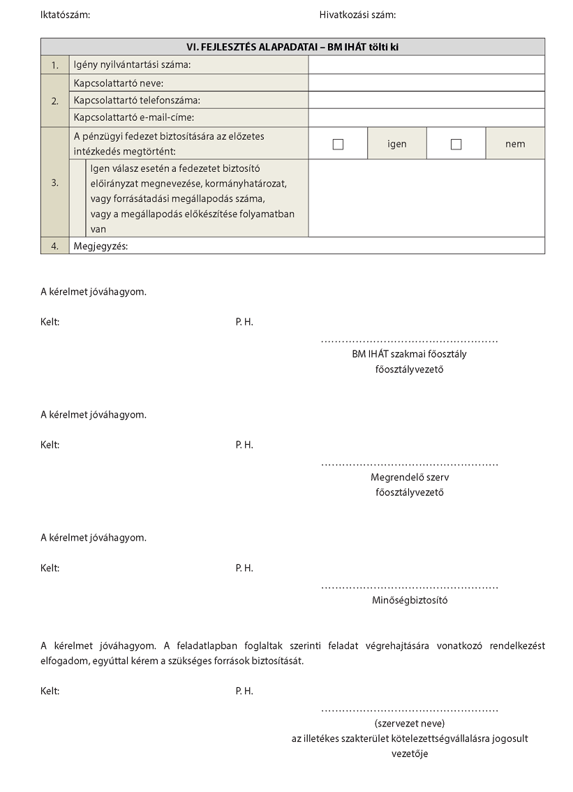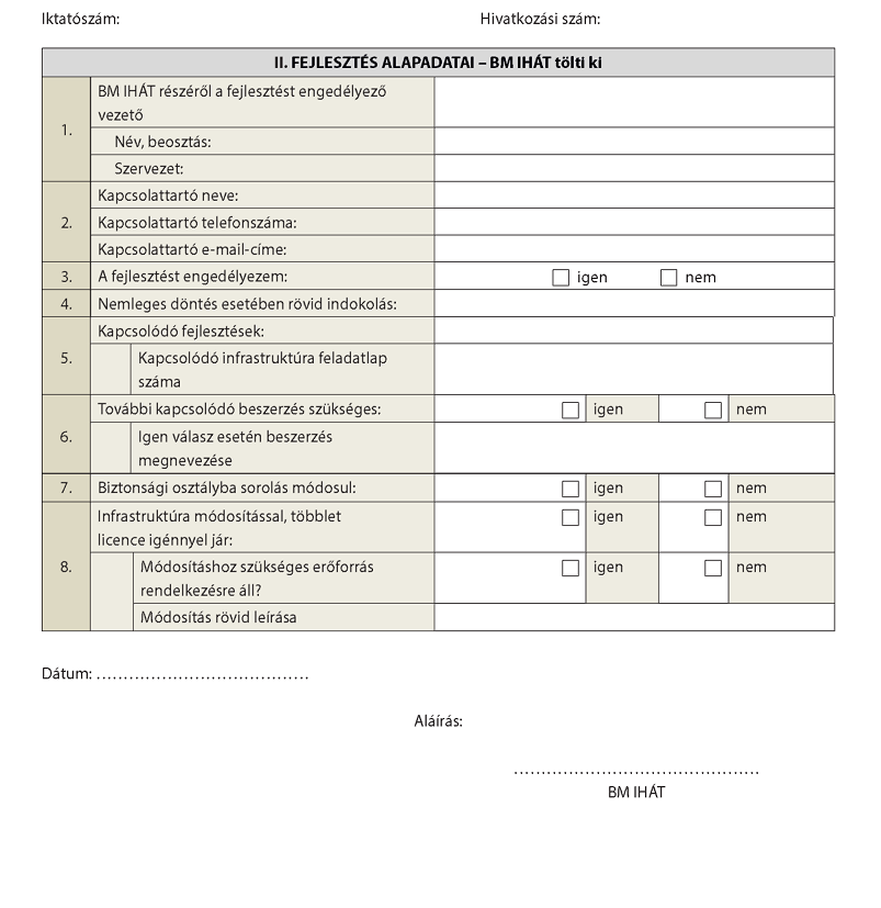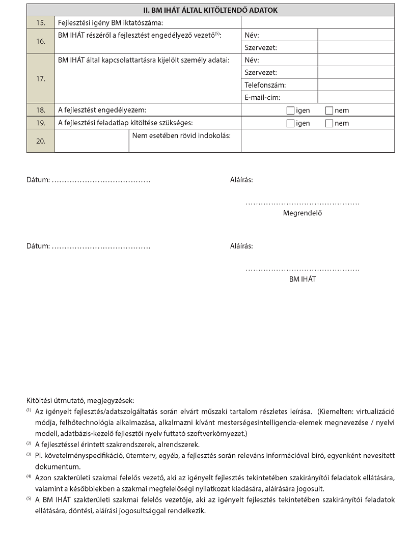 (2) A BM IHÁT a megrendelő szerv és az illetékes szakterület szükség szerinti bevonásával kitölti az igénybejelentő lap II. blokkját, ahol nyilatkozik arról, hogy engedélyezi-e a fejlesztést, illetve igényt tart-e arra, hogy a fejlesztést szorosan nyomon kövesse. Amennyiben igen, úgy a megrendelő szerv kötelezettsége a fejlesztési feladatlap kitöltése és folyamatos aktualizálása.