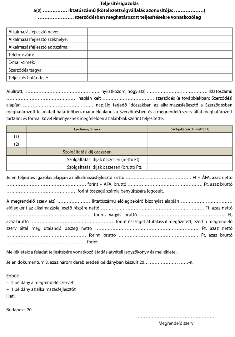 (6) A 7. melléklet szerinti teljesítésigazolás (a továbbiakban: teljesítésigazolás) az átadás-átvételi jegyzőkönyv aláírását követően állítható ki az alkalmazásfejlesztő részére, a fejlesztés tárgyában megkötött szerződésben meghatározottak szerint.