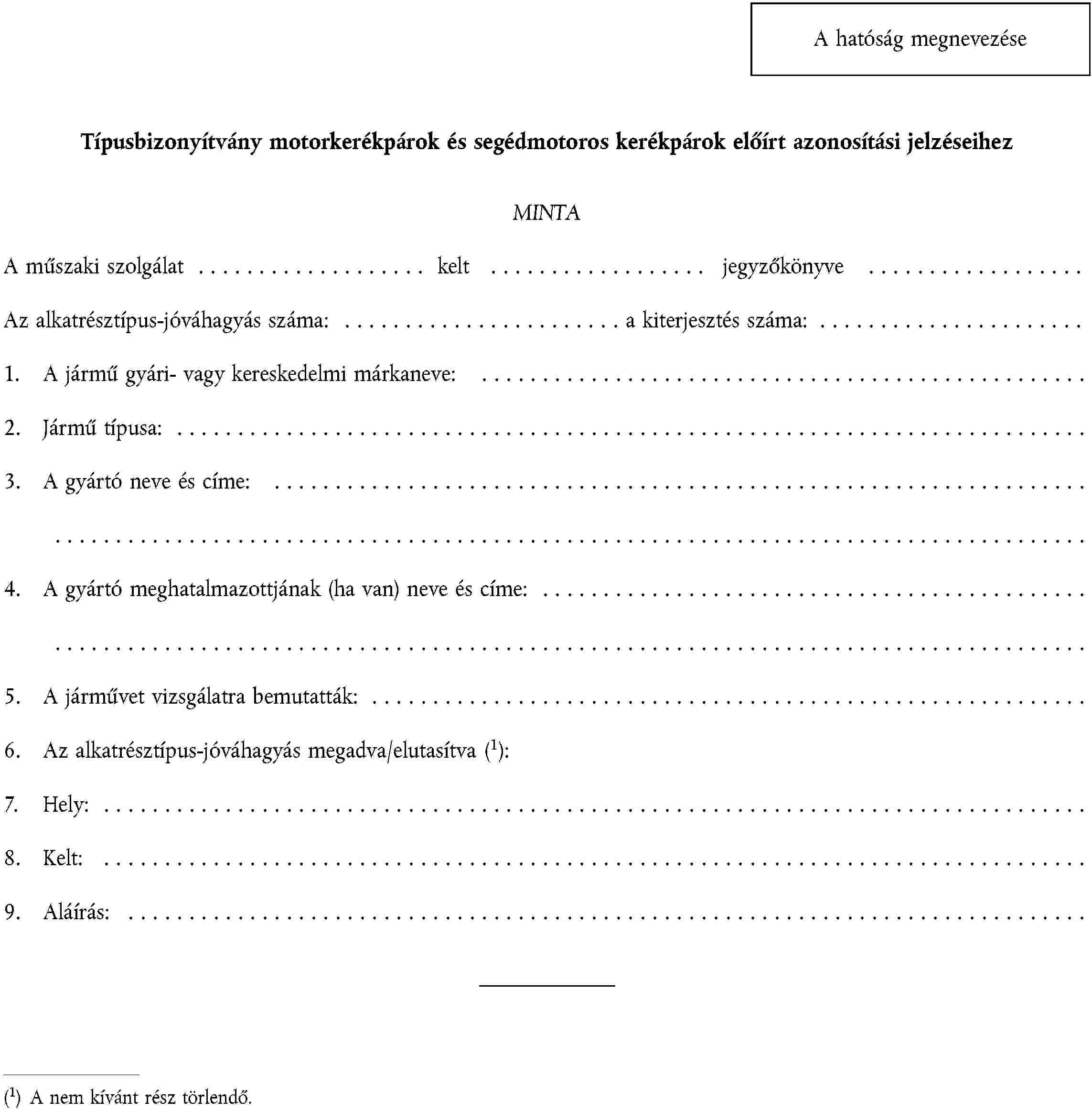 Adatközlő lap motorkerékpárok és segédmotoros kerékpárok előírt azonosítási jelzéseihez