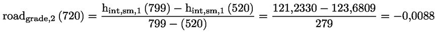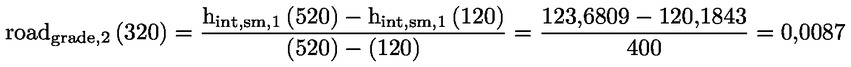 h int,sm,1(799) = h int,sm,1(798) + road grade,1(799) = 121,2550 - 0,0220 = 121,2330 m