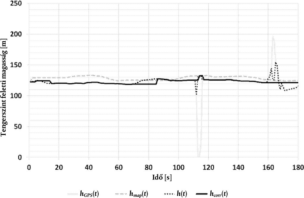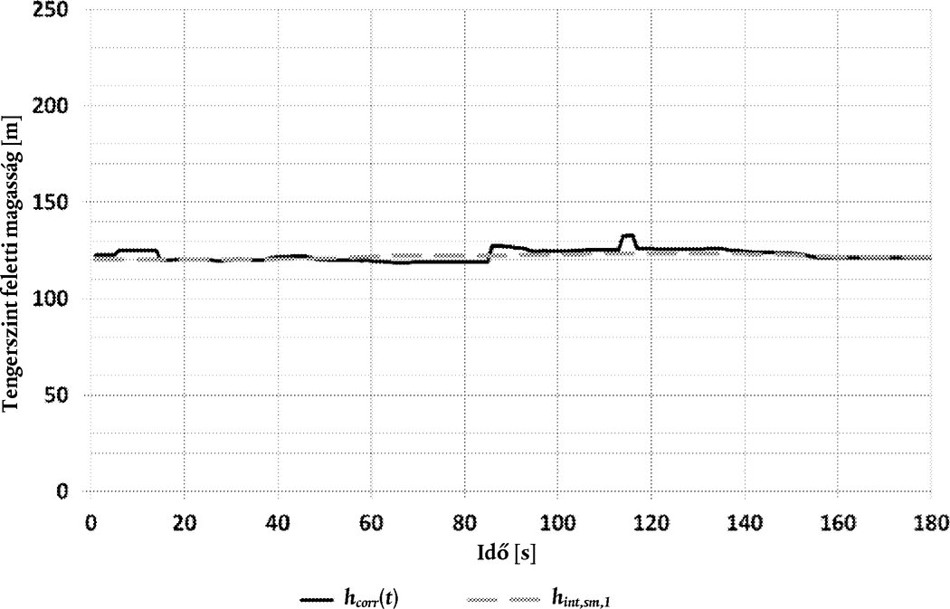 Az adatok korrigálásának eredményeként a hatodik oszlopban szereplő hcorr(t) adatokat kapjuk. A tengerszint feletti magasságra vonatkozó adatokon alkalmazott ellenőrzési és korrigálási lépések hatása a 2. ábrán látható.