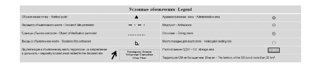 c) A "bejelentett hely" határvonala: a "bejelentett hely" határa részes államonként egységesen meghatározott jellel vagy jelekkel kerül feltüntetésre a vázlatokon. A határvonal jelöli a bejelentett hely külső határát. A "bejelentett hely" vázlata magába kell, hogy foglalja valamennyi területet, melyek kizárólag az "ellenőrzési objektumokhoz" tartoznak, valamint a vázlat külső határán belül helyezkednek el, de más katonai szervezethez tartoznak, illetve az "ellenőrzési objektumok" közös használatában vannak. A "bejelentett hely" vázlat szemlélteti a külön elhelyezésben lévő területek földrajzi elhelyezkedését, távolságát és irányát a bejelentett hely alap objektumától. A külön elhelyezésben lévő területekhez vezető útvonalakat is fel kell tüntetni a vázlatokon. Ha ez más módon nem oldható meg, akkor a "bejelentett hely" vázlathoz térképvázlat csatolása javasolt, amelyen azonosítható a koordináta bemérési pont, valamint szemléltethető a külön elhelyezésben lévő területek iránya, távolsága és az odavezető útvonal. A "bejelentett hely" állhat több nem összefüggő területből is, ebben az esetben minden különálló területnek fel kell tüntetni a saját külső határvonalát a vázlaton.