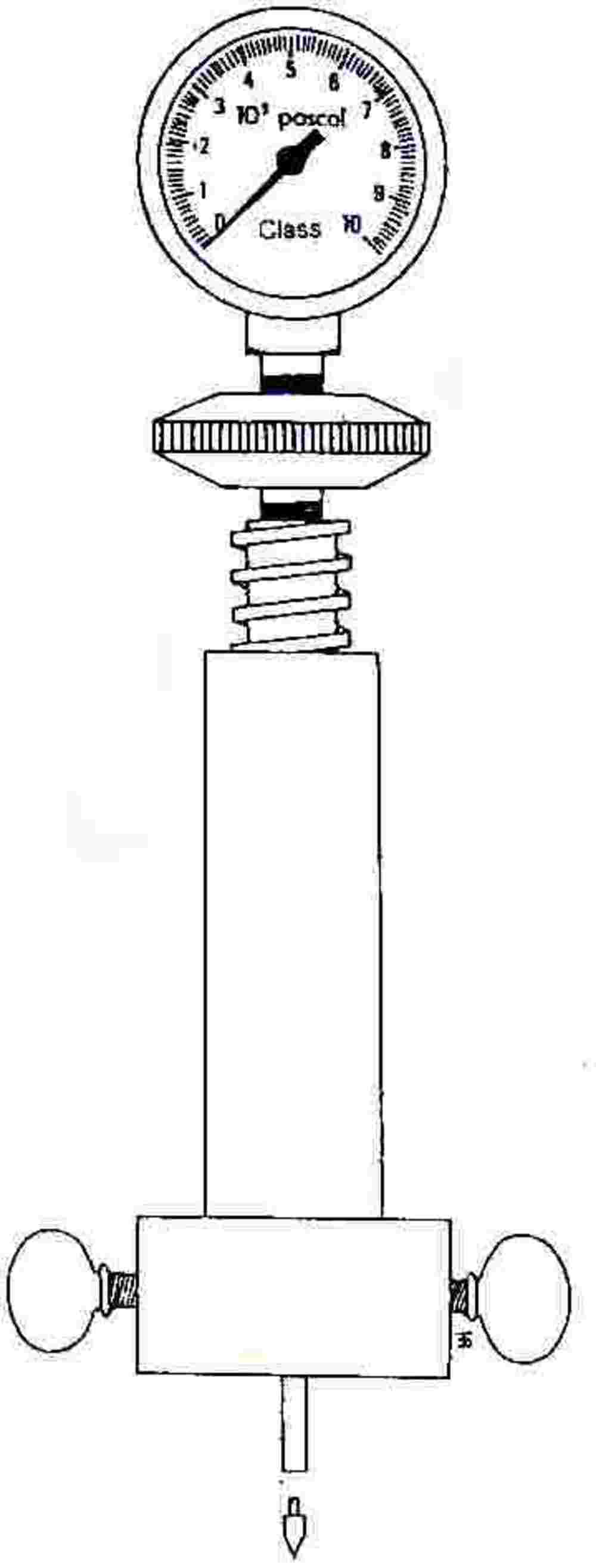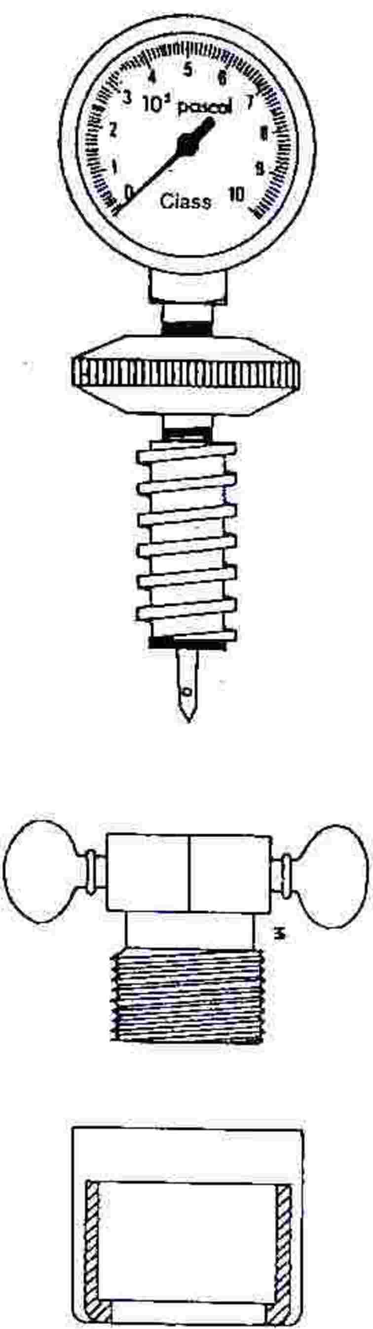 - A felső rész (azaz a csavaros szúrószár) a manométerből, egy kézi szorítógyűrűből, egy, a középső részbe csúszó végtelen csavarból és a kupakon áthatoló tűből áll. A tű oldalán egy lyuk található, amely a nyomást a manométer felé közvetíti. Egy tömítőgyűrű biztosítja, hogy a készülék légmentesen illeszkedjen a palack kupakjához.