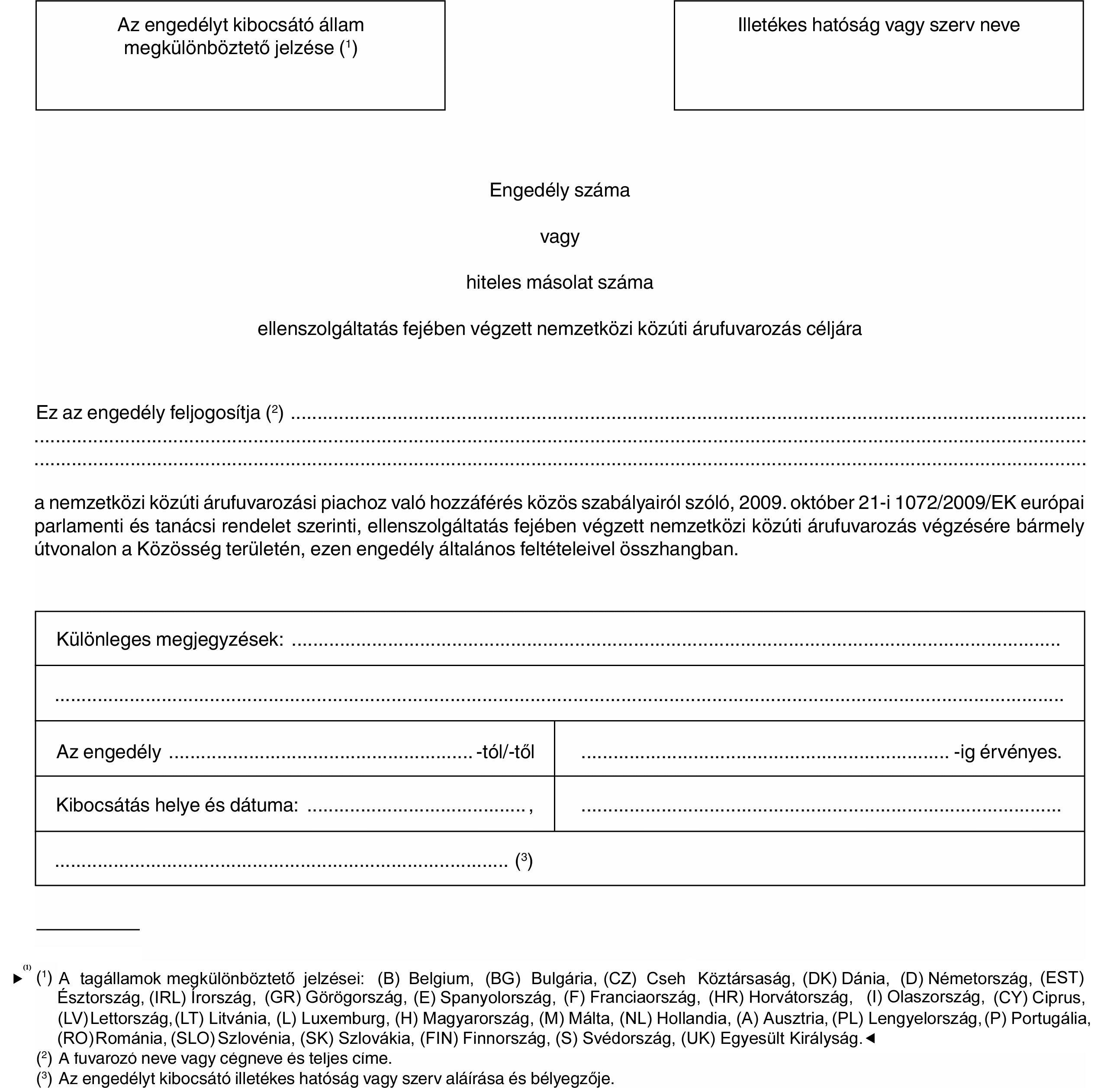 Egy tagállamból harmadik országba vagy harmadik országból tagállamba történő fuvarozás esetén ez az engedély a Közösség területén végzett fuvarozásra érvényes. Az engedély a berakodás vagy a kirakodás szerinti tagállamban csak a Közösség és az érintett harmadik ország között szükséges egyezmény megkötésétől kezdődően érvényes, a(z) 1072/2009/EK rendeletnek + megfelelően.