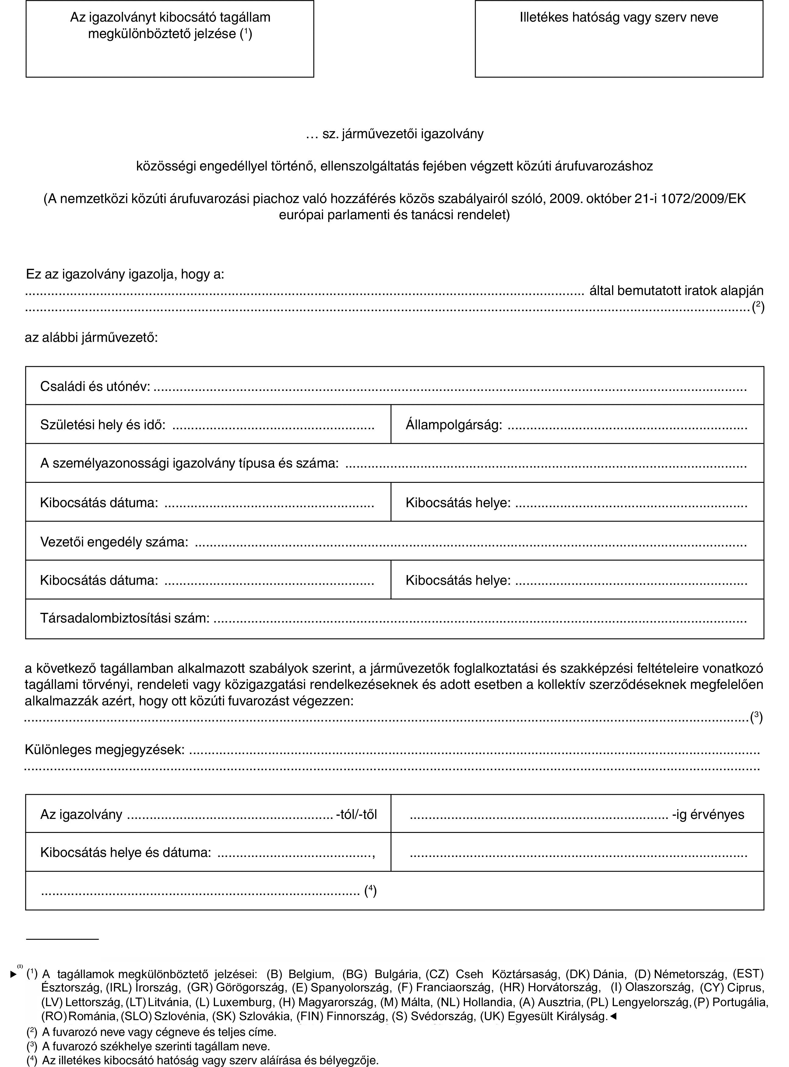 Az igazolvány tanúsítja, hogy az abban megnevezett gépjárművezetőt az igazolványban szereplő tagállamban alkalmazott szabályok szerint, a foglalkoztatási és szakképzési feltételekre vonatkozó törvényi, rendeleti vagy közigazgatási rendelkezéseknek és adott esetben a kollektív szerződéseknek megfelelően alkalmazzák azért, hogy ott közúti árufuvarozást végezhessen.